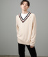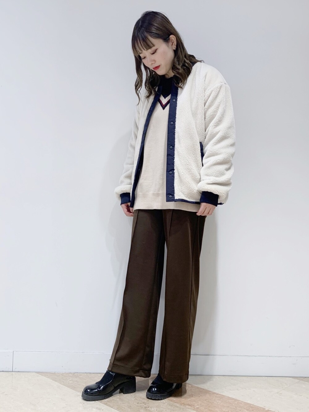 人気のホワイトカラーのボアブルゾンとブラウンのパンツを合わせたウィンターコーデ! ノーカラーなので女性でも綺麗に着ていただけます☺️