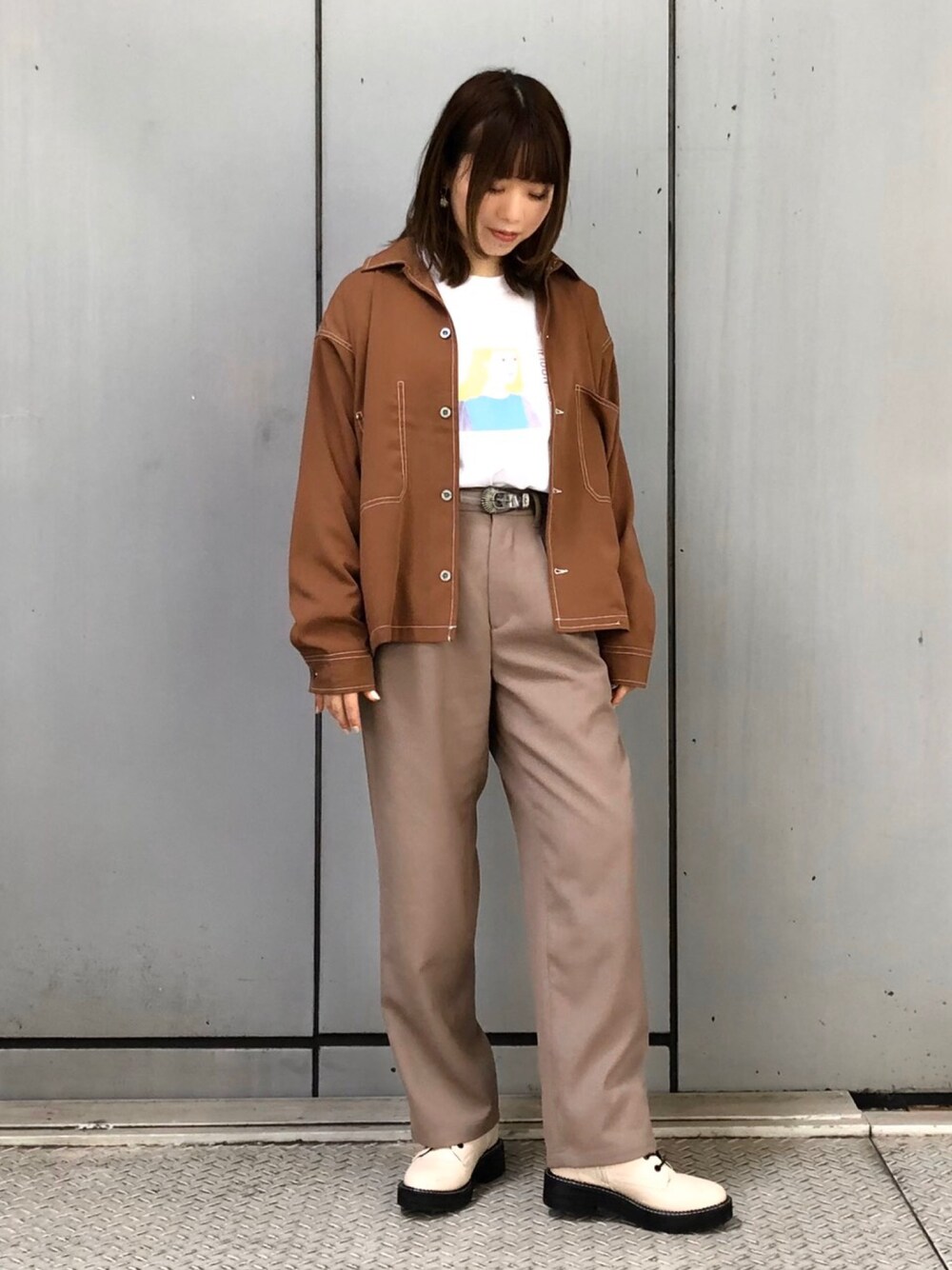 ~ブラウンコーデ~ オーバーサイズのステッチシャツとワイドパンツでゆったり感もありつつ、ロンTをタックインすることでスタイルアップ効果も◎