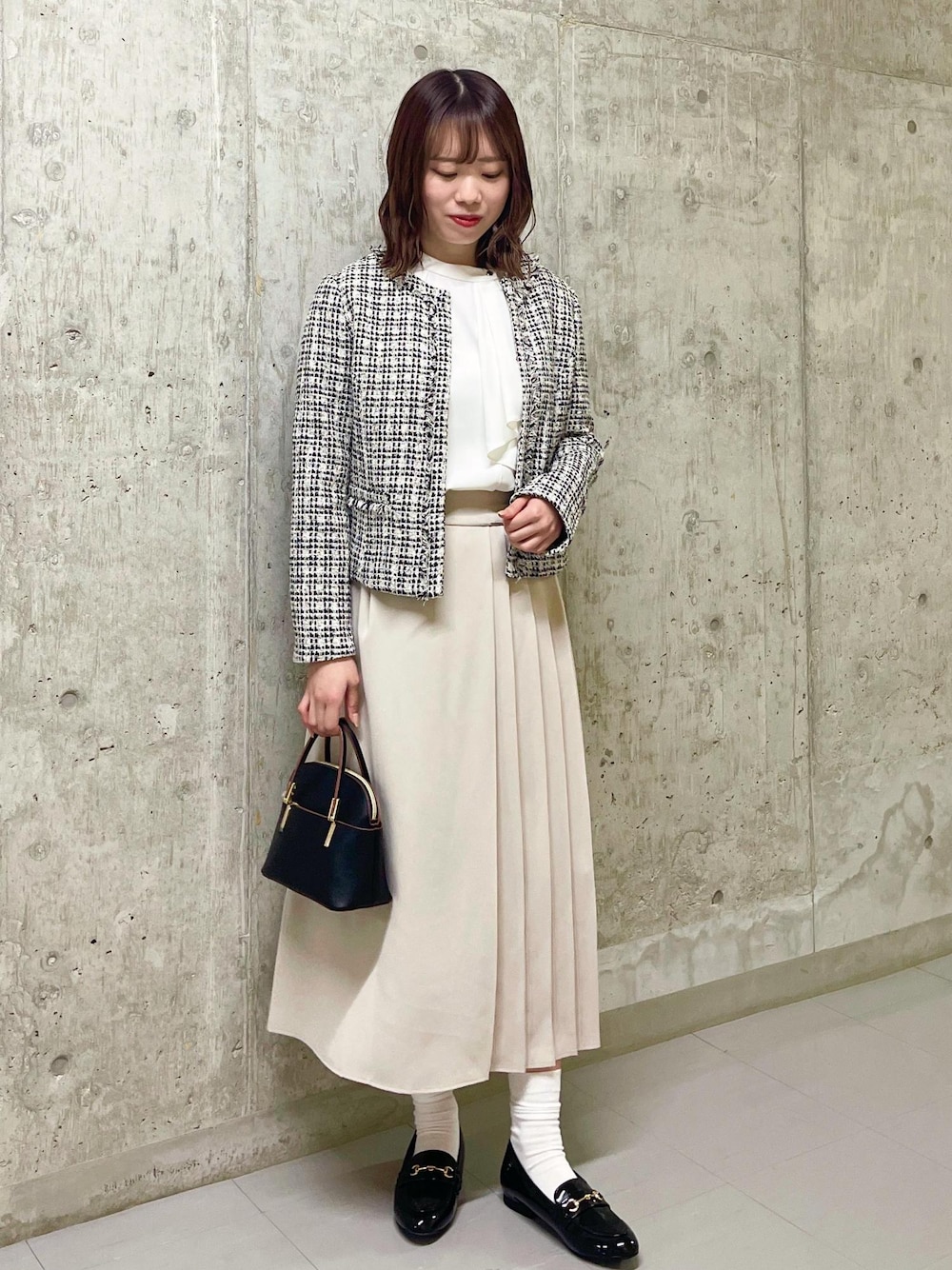 ご覧いただきありがとうございます!♡ 華やかなツイードジャケットとベージュのプリーツスカートを合わせてハレの日のコーディネートに仕上げました◎ インスタ>>>@pic_mako_