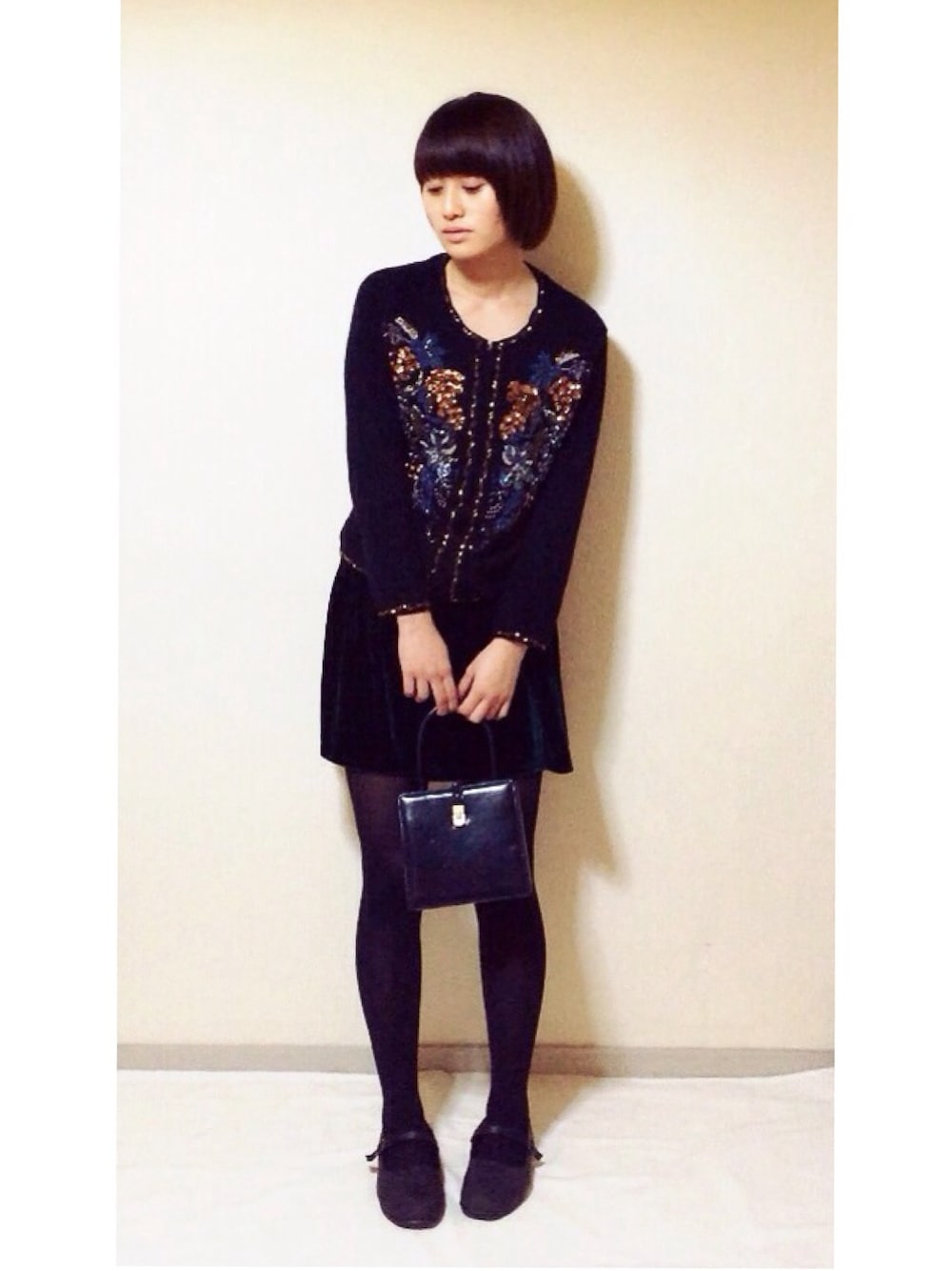 キラキラスパンコールニットにベロアスカート☆ 無印の靴は合わせやすくて毎日はいてます カーディガン:used スカート:FREE'S MART バック:used 靴:無印