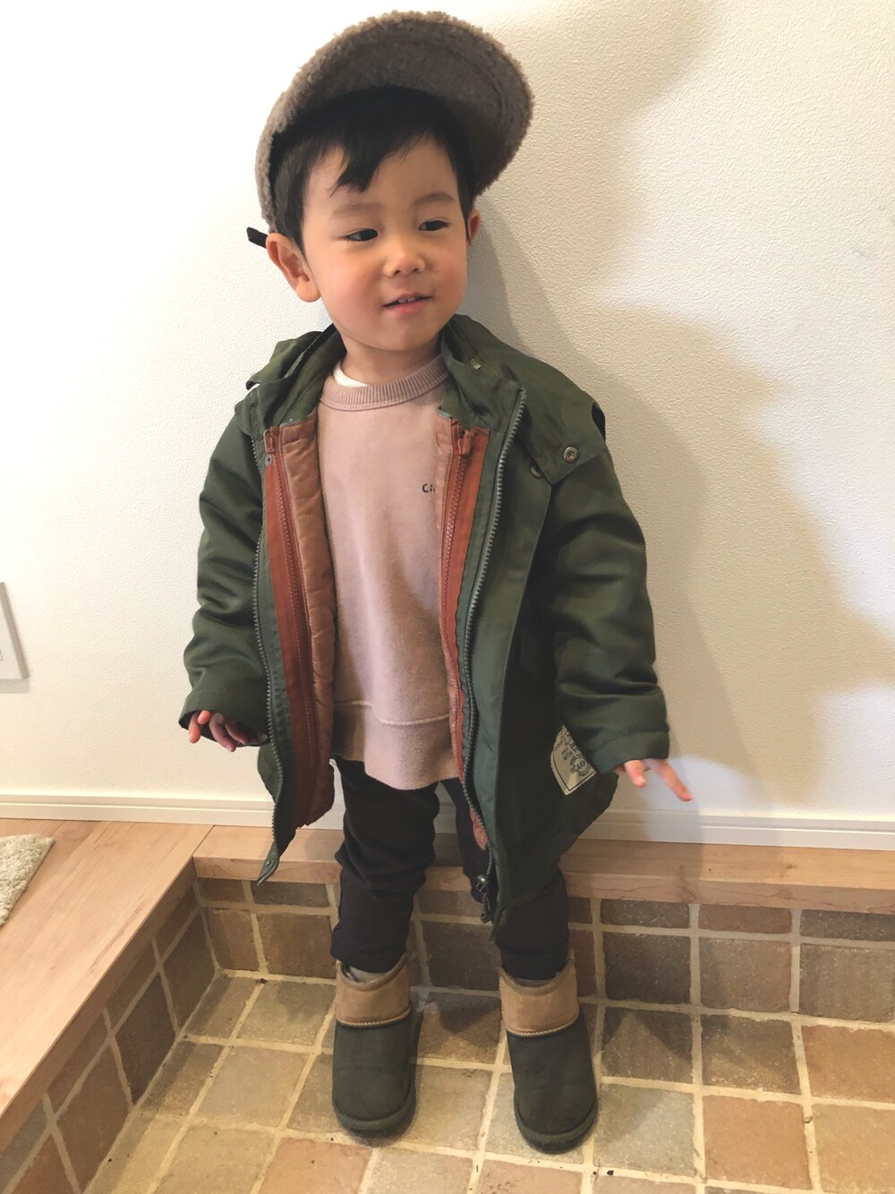 DILASHの3wayコート。 寒い風も防げて、元気に外で砂遊び。 ファスナー閉めると、急に大人っぽくてかっこいい。 しかし、まだまだ甘えんぼ3歳児。
