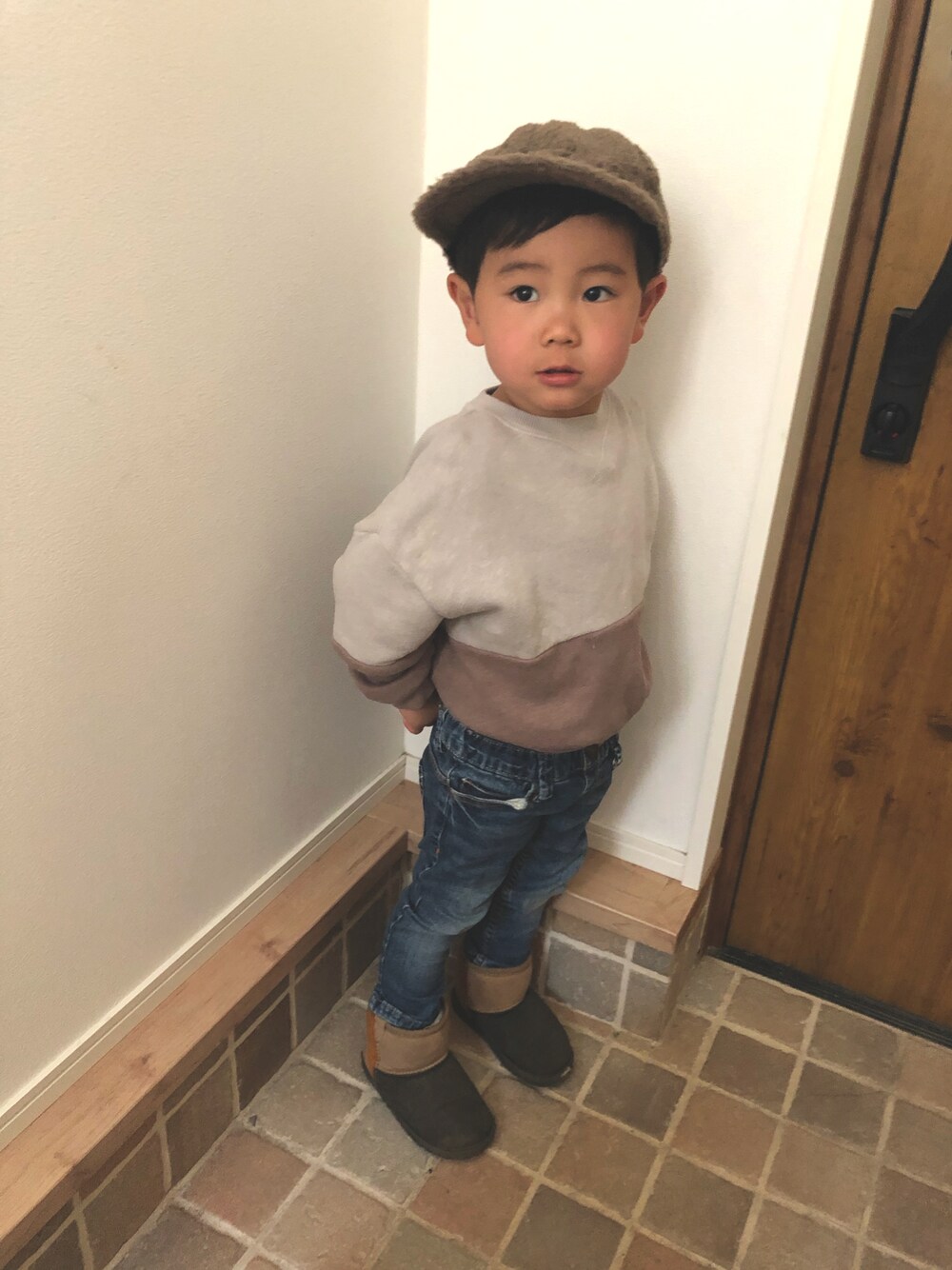 最近自分で服を選ぶようになった息子。 BREEZEの帽子と靴お気に入りで季節感を無視してる。笑