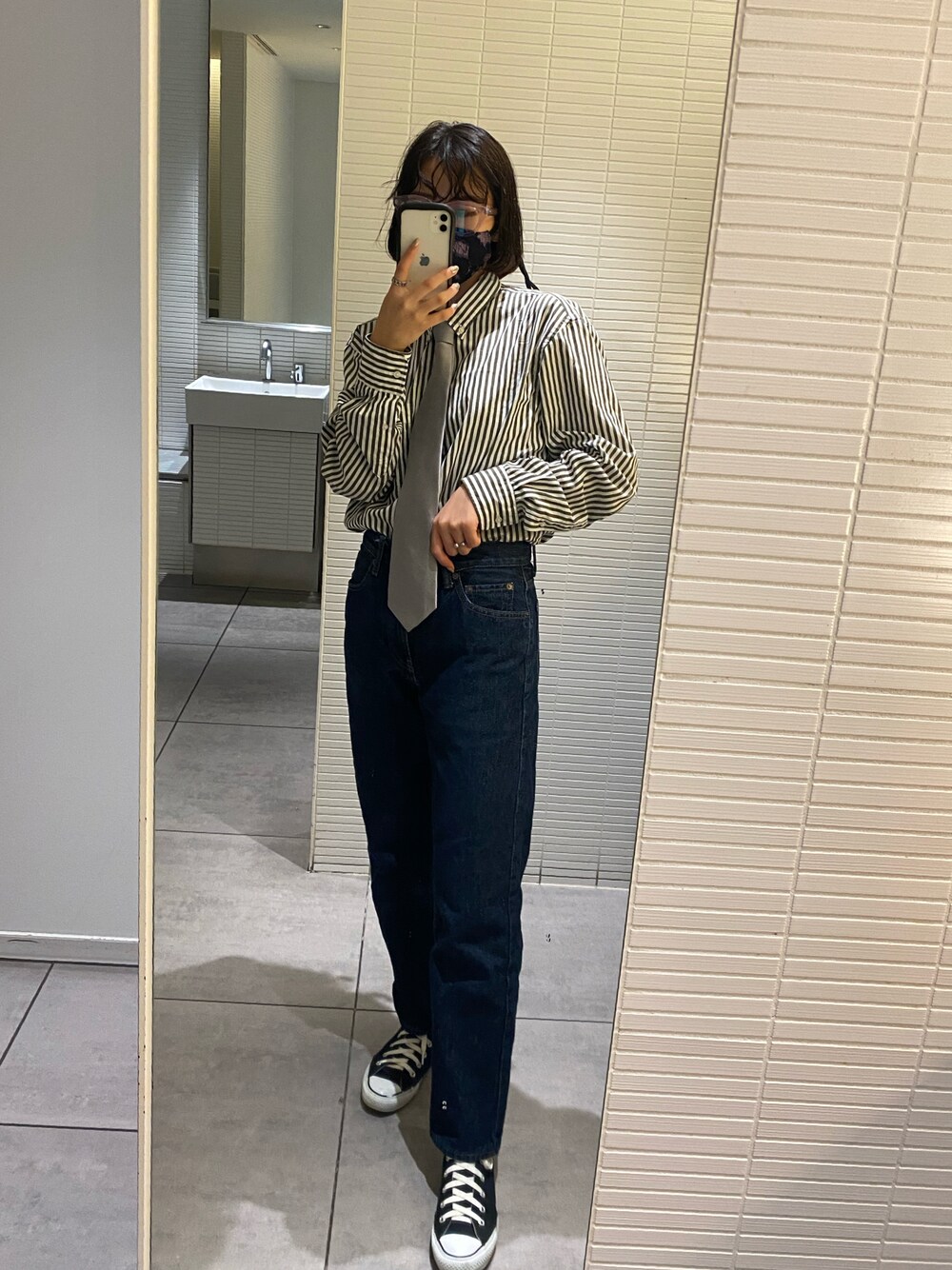 all UNIQLO code🤍 タイスタイル可愛い〜 このデニムはメンズのレギュラーフィット! おすすめだよ☀️