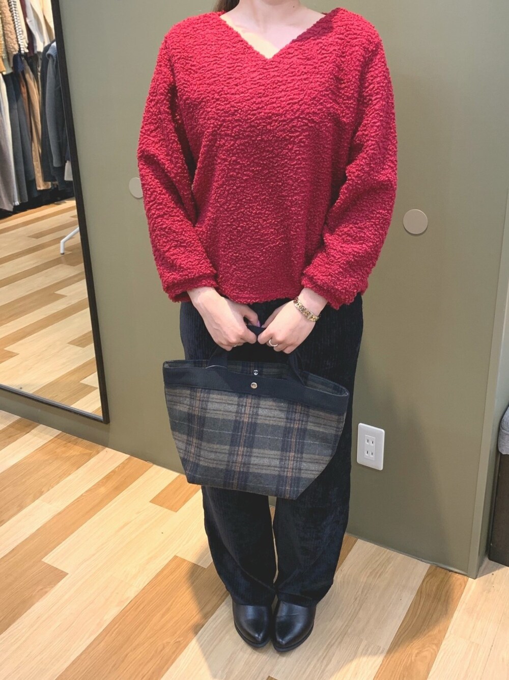真っ赤な赤が目をひくニットです💓 Vネックなので顔周りも すっきり見えます👍 リブのベロアパンツも とっても履きやすいです👏