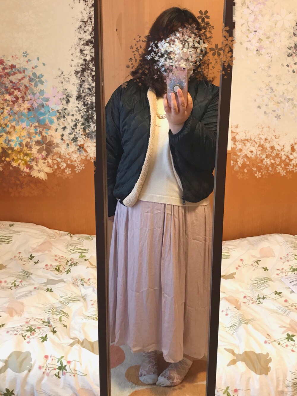 ボアジャケットの裏側の黒のキルティングジャケットをアクセントに、ピンク系コーデにしてみました🌸💗 早く春にならないかなぁ🌸🌼💗