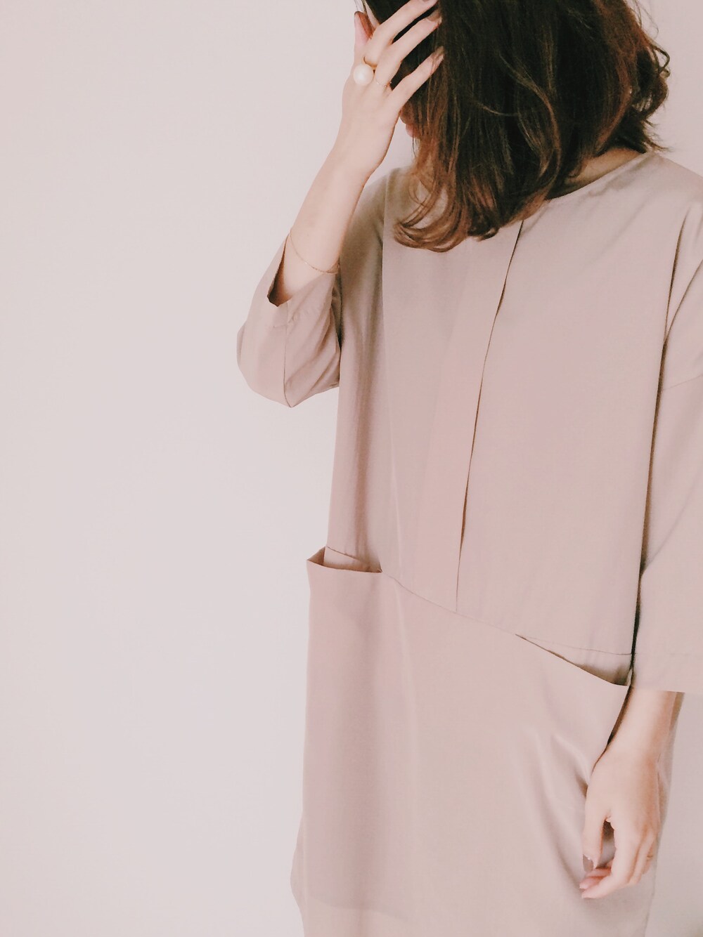 ベージュ系のワンピースを着用したレディースの春コーディネートの1枚目の写真
