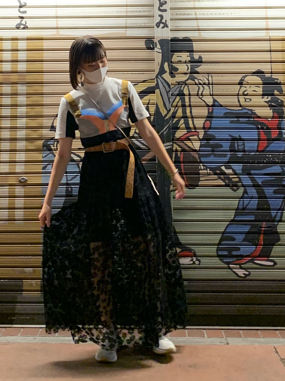 この日は浅草にお出かけした時です。 まだ9月でしたので半袖がちょうど良かったです。 このスカートは丈が長いので上にあげてベルトをしてます。 中は太ももが見えないように黒のタイトパンツを履いて隠してます。