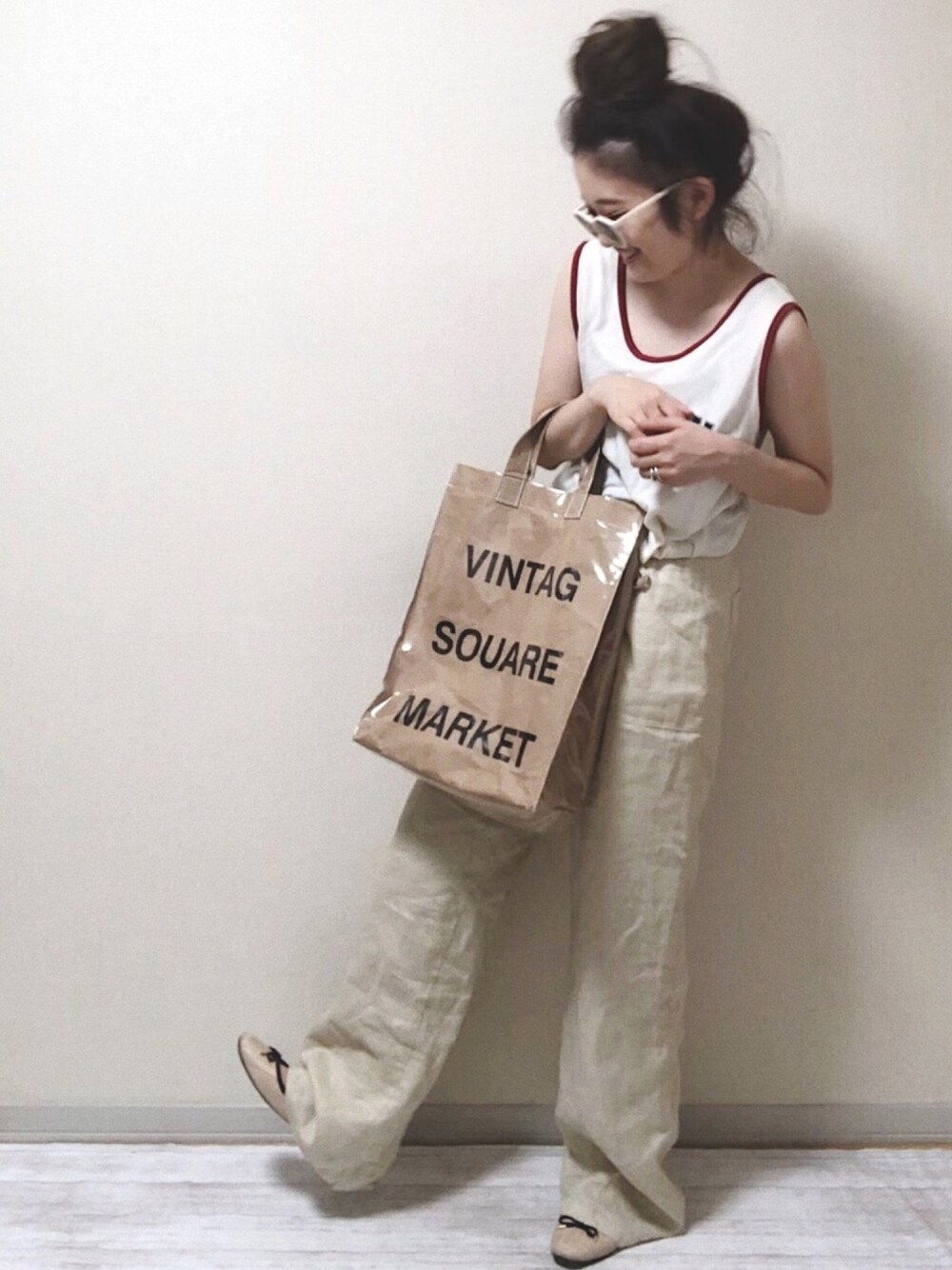 タンクトップのカラーが可愛いのでよく着ています❕英字のバッグもA4サイズも入るし大容量でとっても便利です可愛い〜〜〜❕ パンツはUNIQLOです❕
