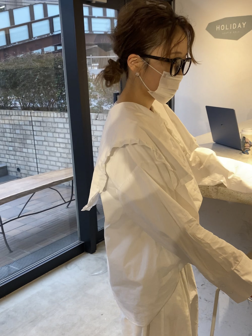 ホワイト系のトップス、ブラック系のメガネを着用したレディースの春コーディネートの1枚目の写真
