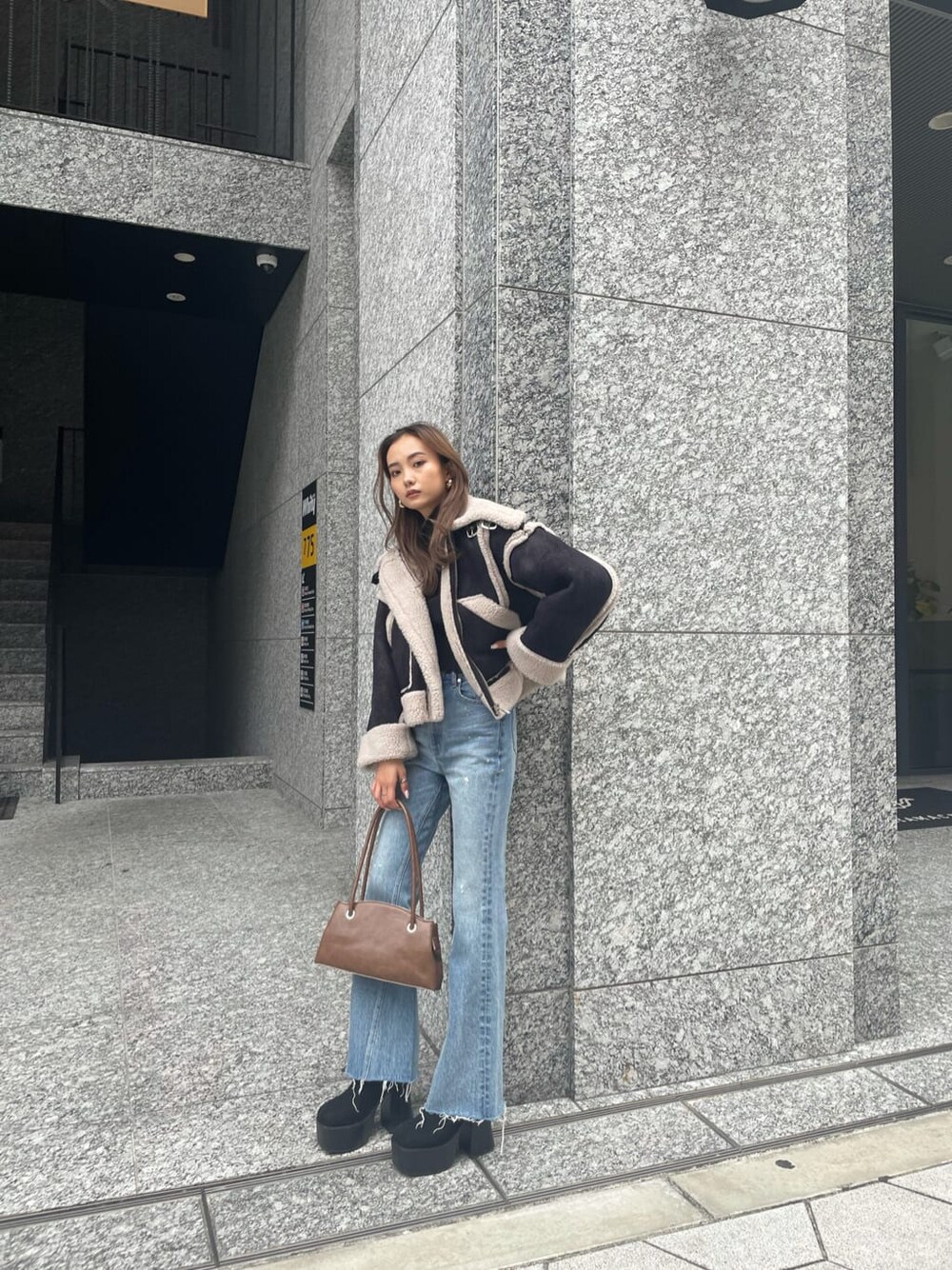 濱田 萌衣(EMODA)(EMODA)のムートンコート「ショートフェイクムートンブルゾン」を使ったコーディネート