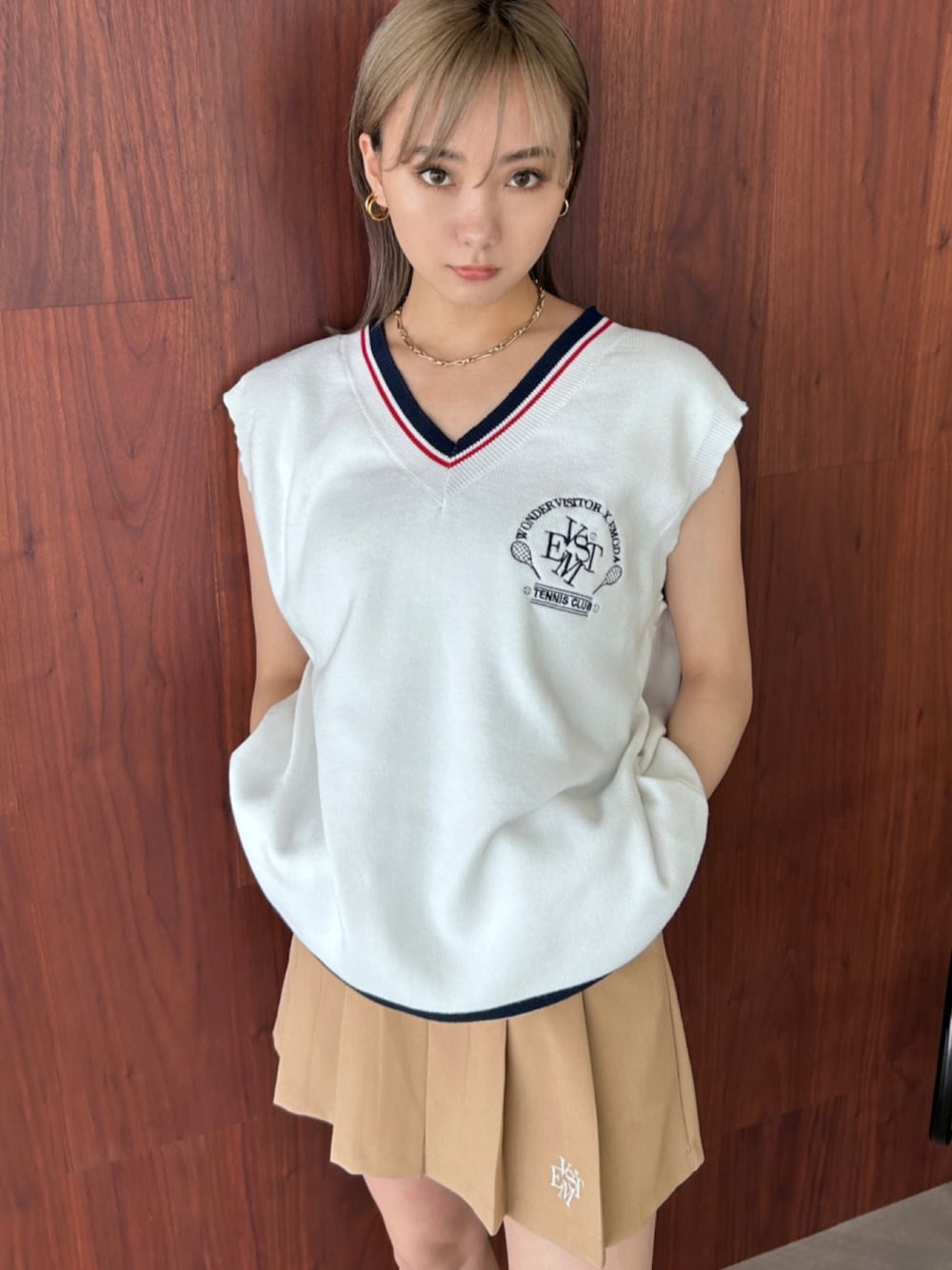 濱田 萌衣(EMODA)(EMODA)のベスト「【WONDER VISITOR×EMODA】エンブレムロゴニットベスト」を使ったコーディネート