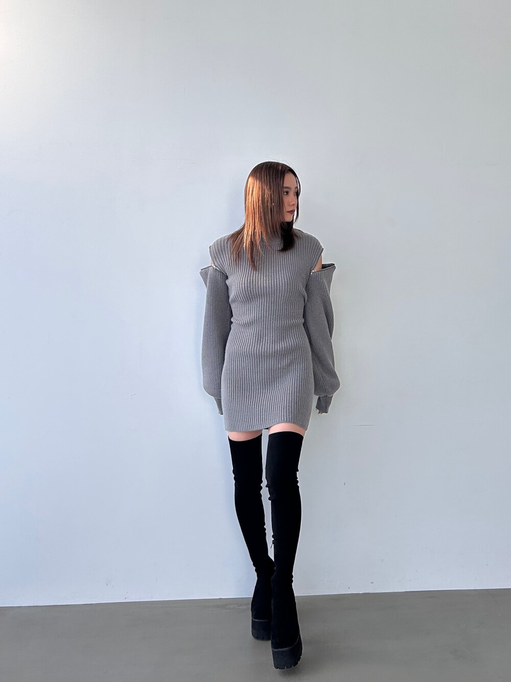 ショルダーにZIPデザインが施された、ミニワンピース。 ZIPを開けても閉めてもどちらでも着用が可能。EMODA定番のサイハイブーツとの相性が抜群♪♪