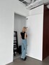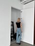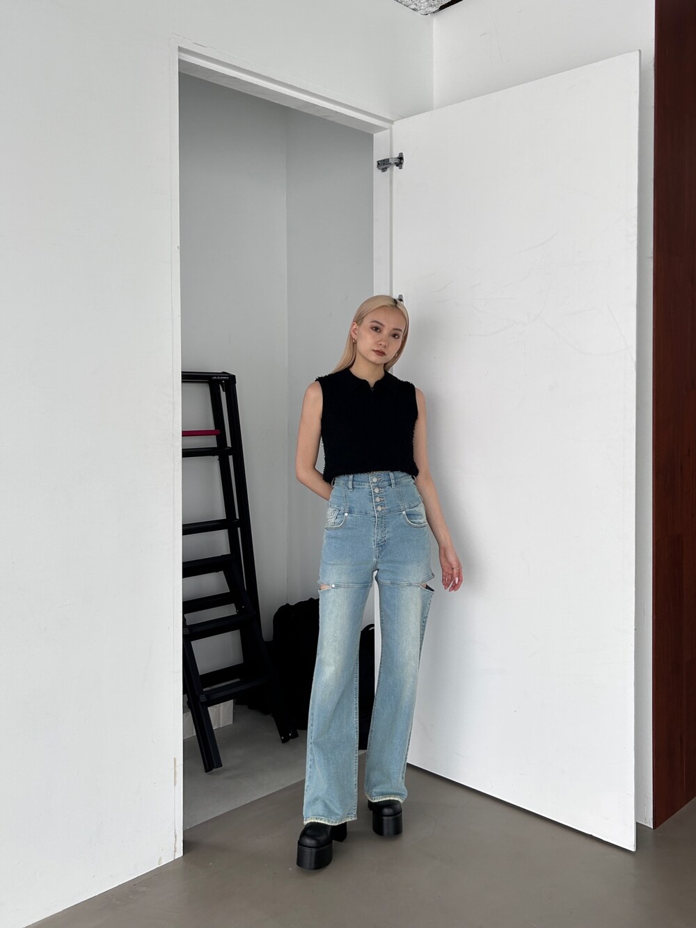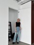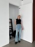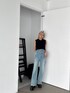 スリットデニムと大人気フリンジデザインのトップスを合わせたスタイリング♪ 明るいデニムの組み合わせて黒のトップスも夏見え♡