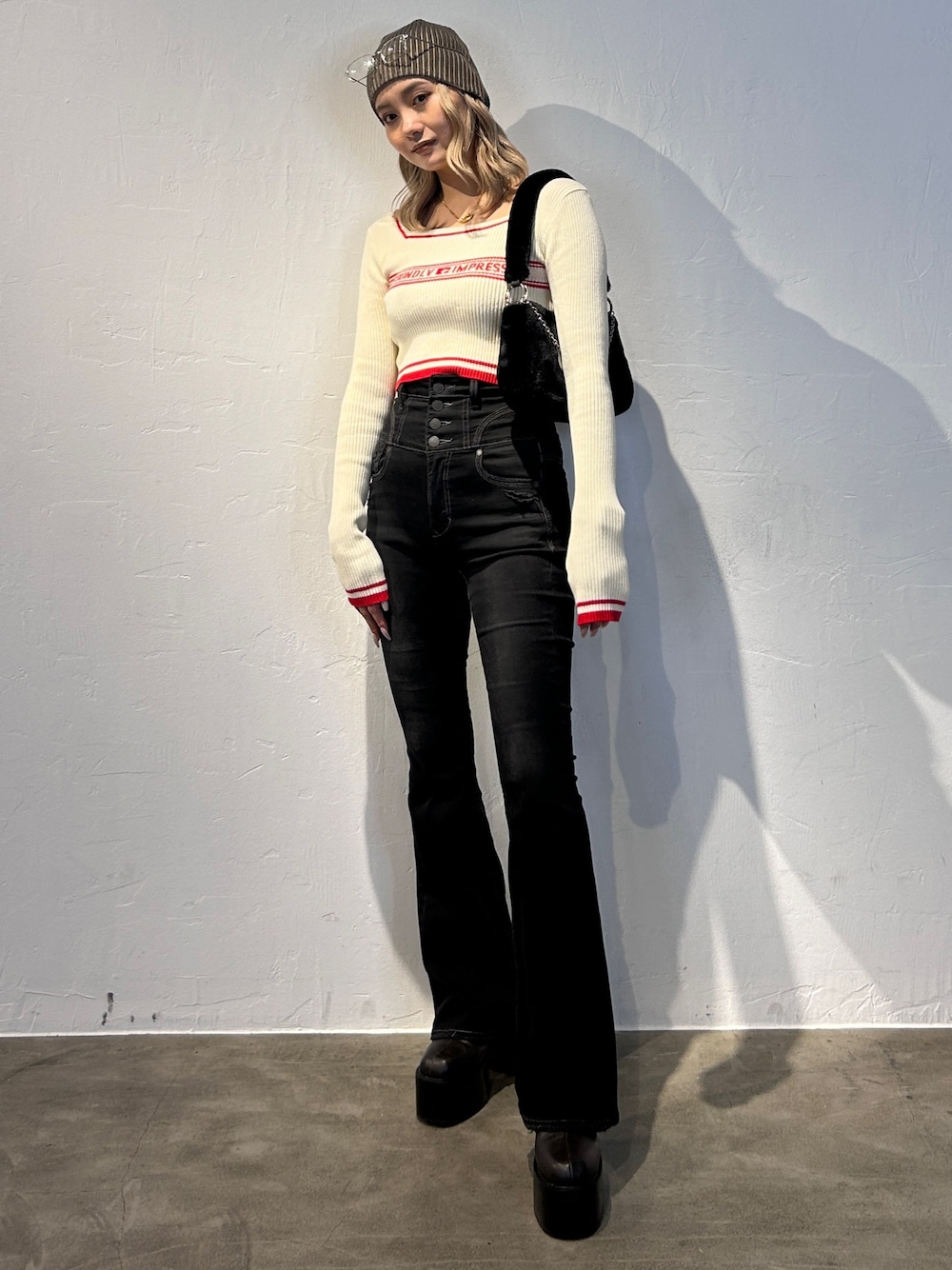 濱田 萌衣(EMODA)(EMODA)のデニムパンツ「スーパーハイウエストフレアパギンス」を使ったコーディネート
