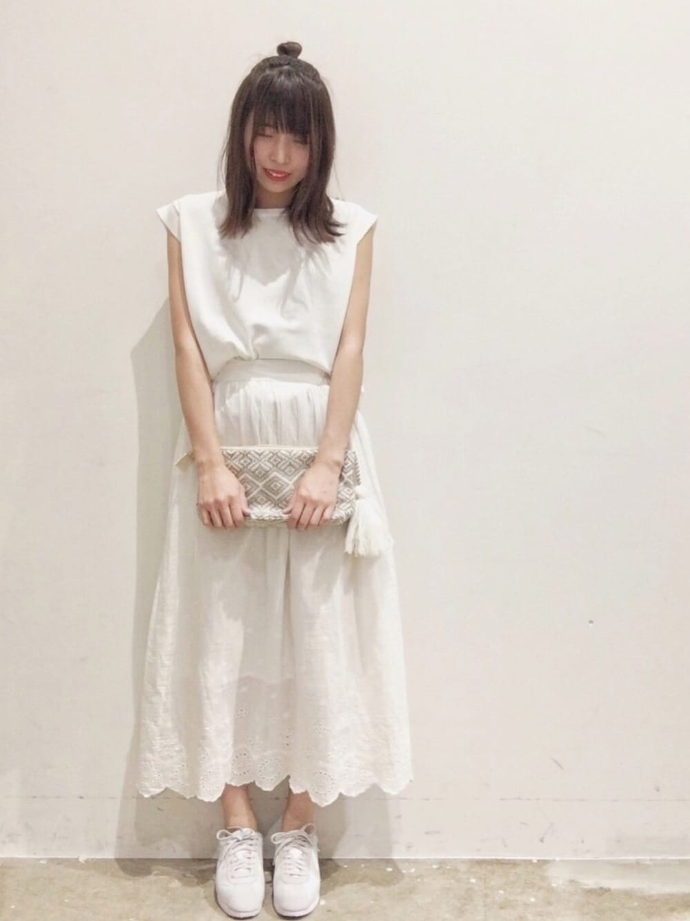ご覧くださりありがとうございます✨ オールホワイトコーデをしてみました。 ノースリのサマーニット×綿スカートは涼しくて夏におすすめです\( ˆoˆ )/