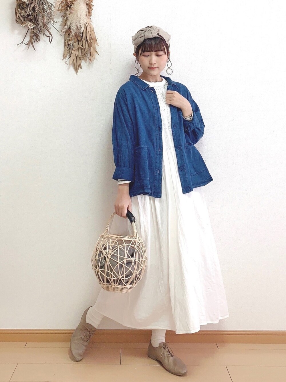 白ワンピにデニム合わせは 爽やかで 夏らしい印象になります 𓇬 こちらのジャケットは、 インディゴ染めで 洗う度色の変化が楽しめます ヘンプ綿なのでやわらかく吸湿 吸水性に 優れているので 夏にもオススメです ⋰
