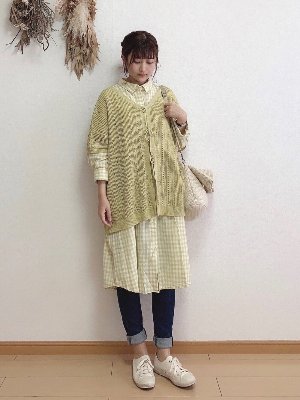 イエローのギンガムチェックチュニックに イエローのカーディガンを合わせて 統一感バッチリです 𓇬 カーディガンは前後着用アイテムなので リボンを後ろにすることもできます !