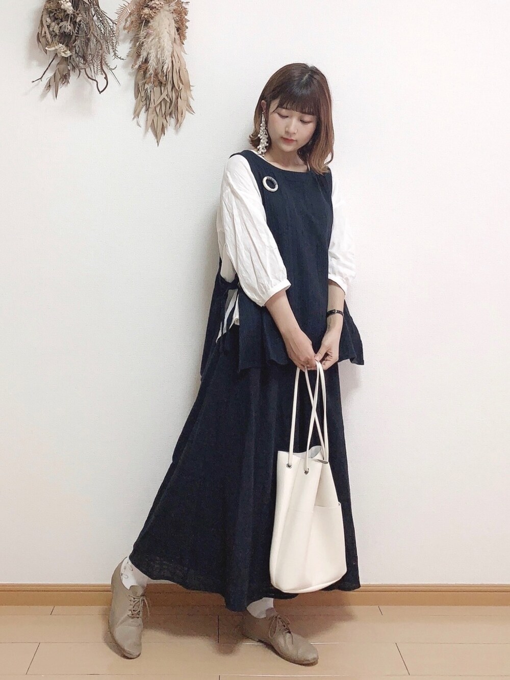 たまには モノトーンコーデ 𓇬 ベストとスカートの色を合わせて セットアップ風に着てみました ベストはサイドのリボンがポイント! スカートは黒ですが さりげなく柄が透けるので 軽い印象で着られます 𓅮 ⸒⸒ どちらも秋まで使えそう ♡