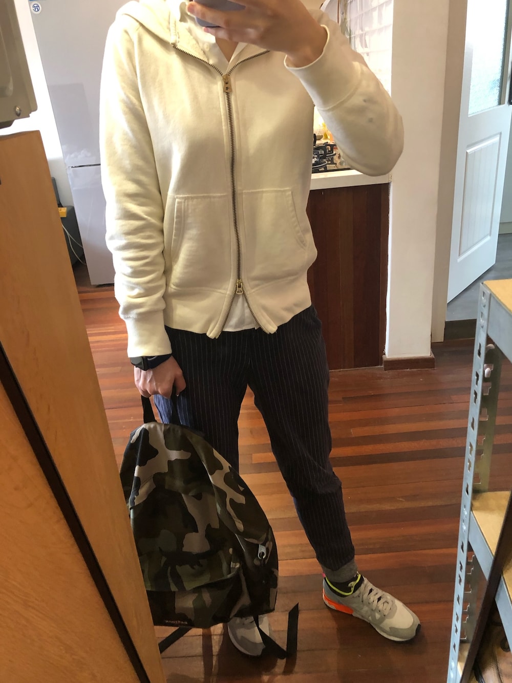 寒さ対策&動きやすさ重視で。 パーカー は上下にジップがあるのが気に入ってます。 靴ひもは黒だったのを、今日はボディと同じ薄いグレーに変えました。気分でラベンダー にしたり濃い紫にしたりします。 EASTPAKは15年使ってても壊れない。すごい。