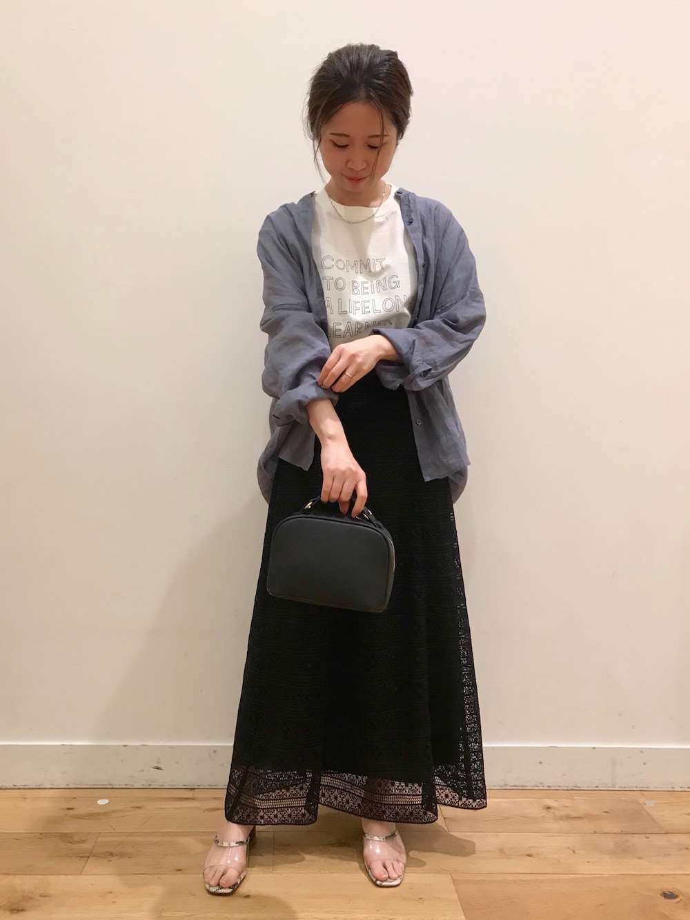 さらっとした着心地のラミーシャツです。 1枚で着ても可愛いですし、 肌寒い時は羽織としてもお使い頂けます。 レースが大人っぽく女性らしいスカートと合わせました^ ^