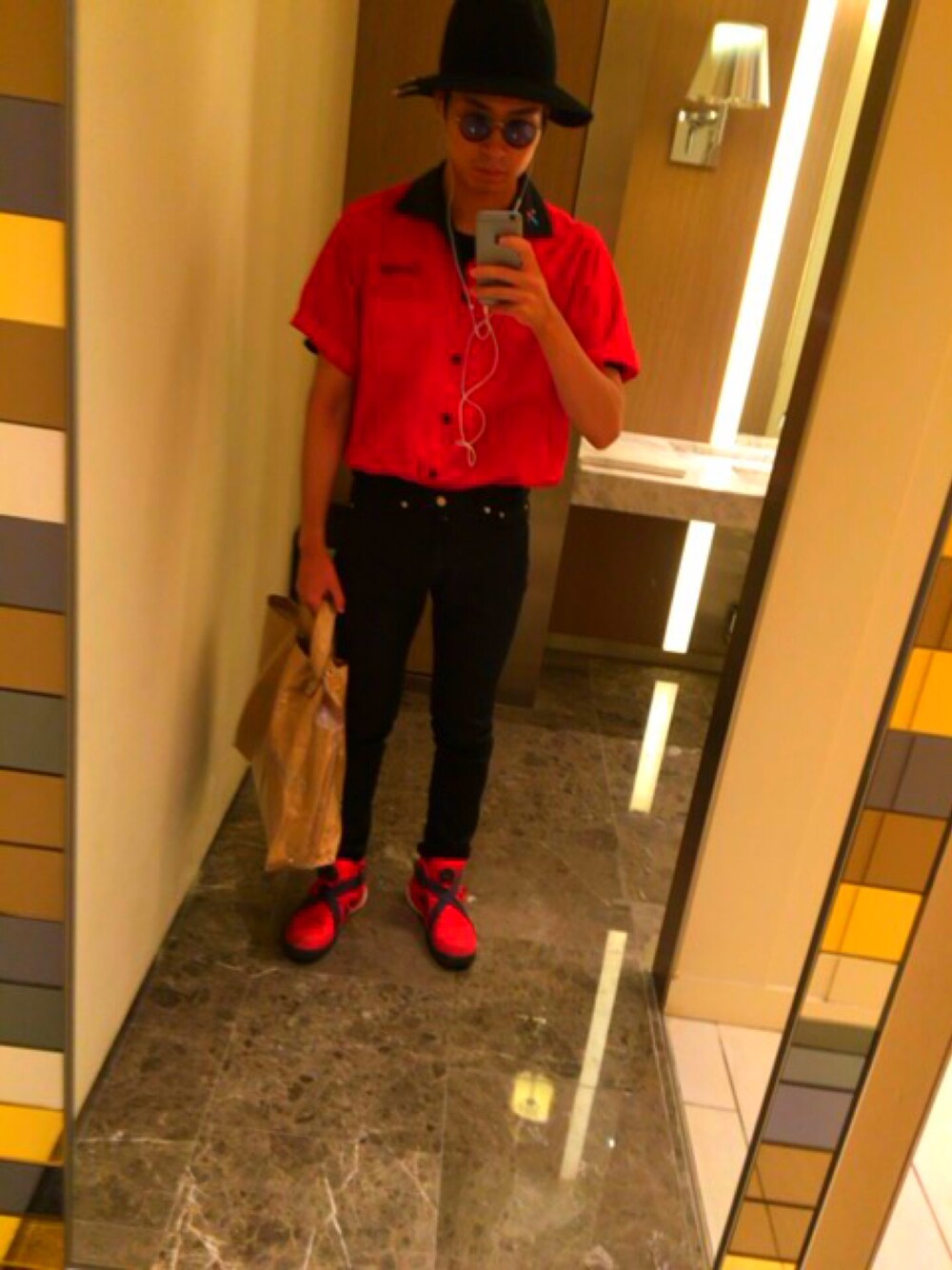 こんばんは😌 USEDのボウリングシャツがオーバーサイズ気味で今っぽいので、スキニーでメリハリつけて、足元赤で揃えてみました! 写真で撮ると、ハットが実際の倍くらい大きく見えるのはなぜ…笑