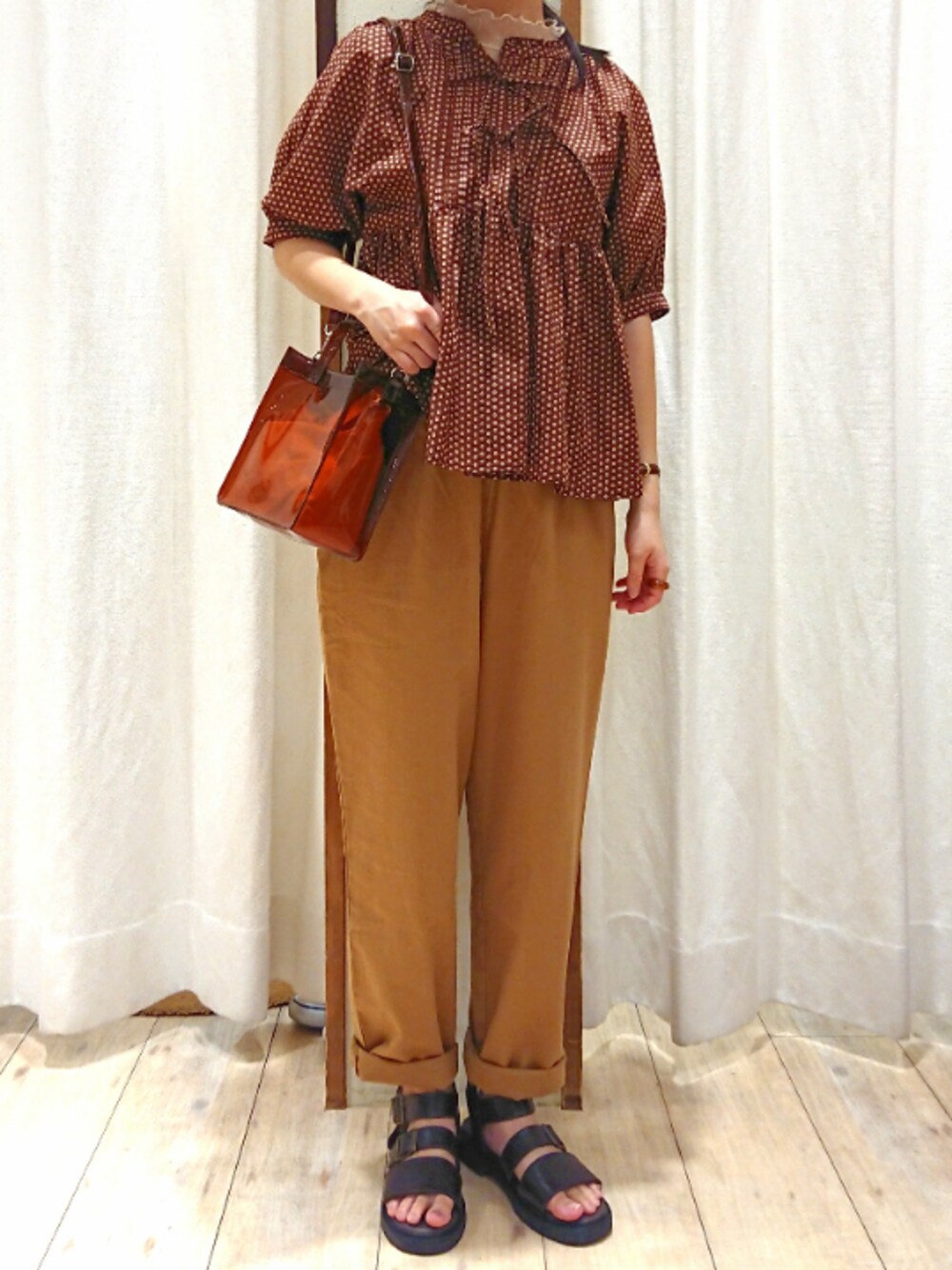 夏のブラウン着回しコーデ🌻 前回のパンツの着回しです! ‐blouse‐ 二の腕などのキニナル部分を隠してくれる主役アイテムです✨ 色違いのミントグリーンも今年らしくてオススメ✅ ーpantsー 着回し抜群の履きやすい楽チンパンツ。 店頭では60%OFFの値下げで1300円とプチプラ✨ (ZOZOTOWNでも40%OFFです!!) ーclear bagー 今年トレンドのクリアバック👜 ロゴデザインも可愛いくシンプルなコーデのアクセントにも◎