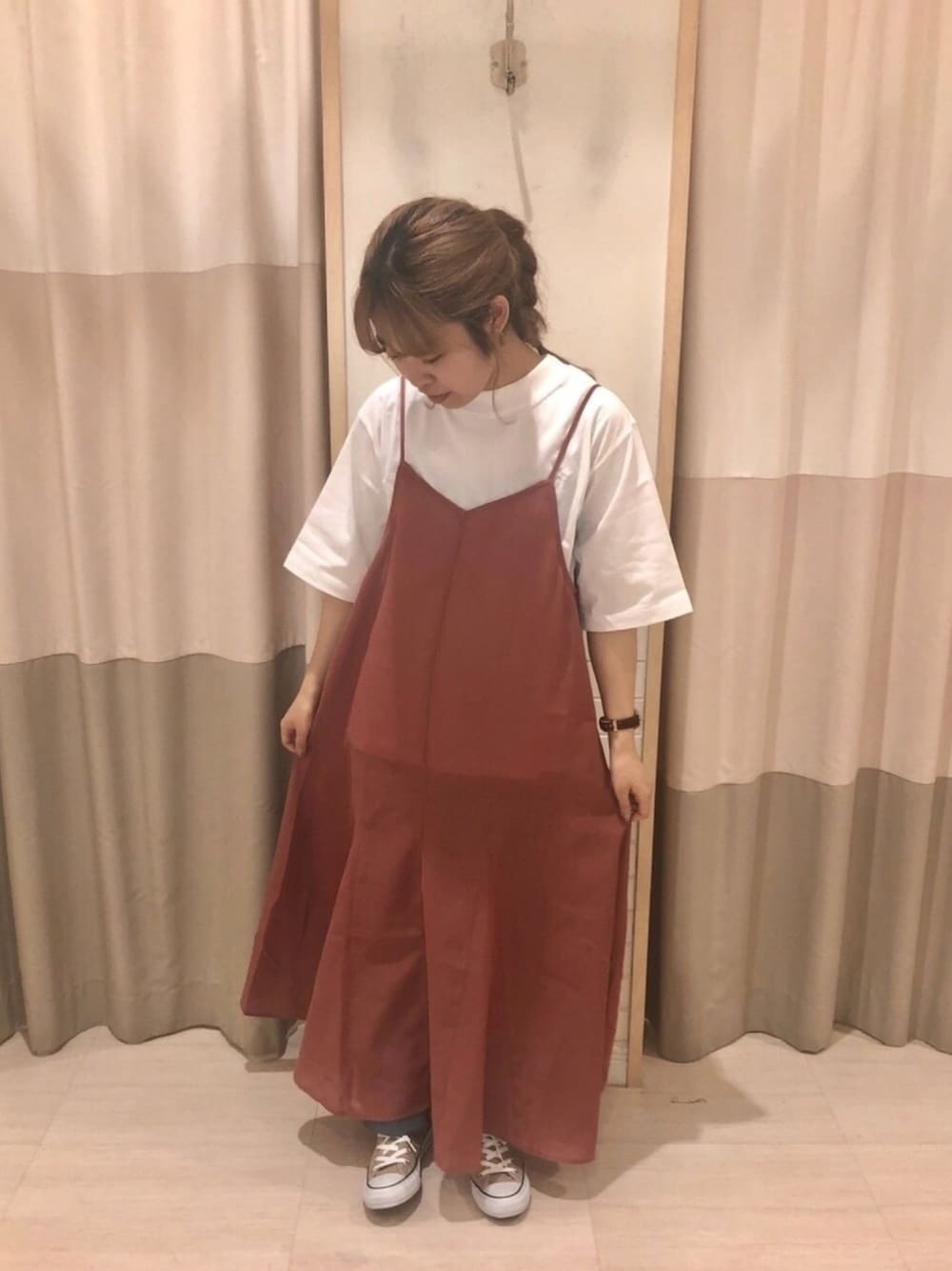 おはようございます🍅 サマンサモスモスブルーのコーディネート です! 透け感のあるキャミワンピは、 裾のフレアが歩く時にひらひら〜と なる感じがかわいいです シンプルなTシャツや柄物のTシャツ、 夏場はノースリーブのカットソーと 合わせるのもおススメです! 写真だとあまり見えていないのですが、 (申し訳ございません!) ワンピの下にデニム合わせてます!