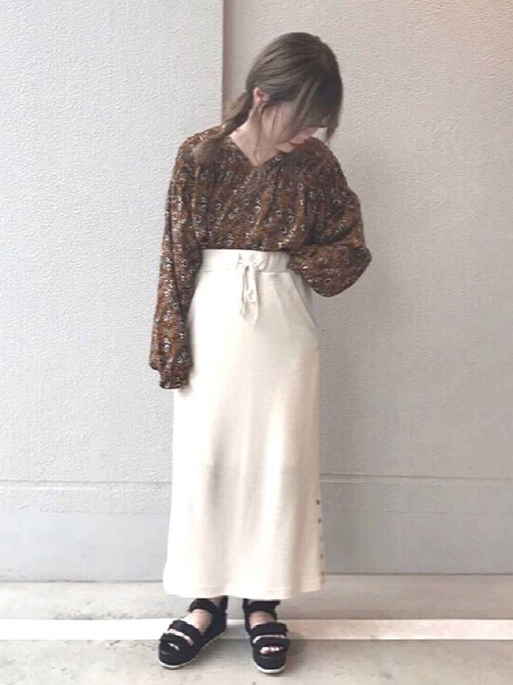 •ᴥ• m i mのスカート「ワッフル裾サイドドットボタン付きナロースカート」を使ったコーディネート
