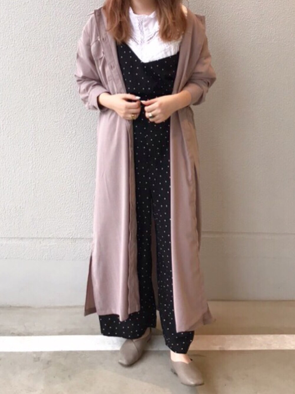 ˗ˋˏご覧いただき、ありがとうございますˎˊ˗ 羽織としても着れるサファリシャツワンピース、 ゆったりしたサイズ感で着心地いいです🍡 ピンクベージュのダスティな色味は 黒白ドットのサロペとよう合います(∗˙—˙∗)