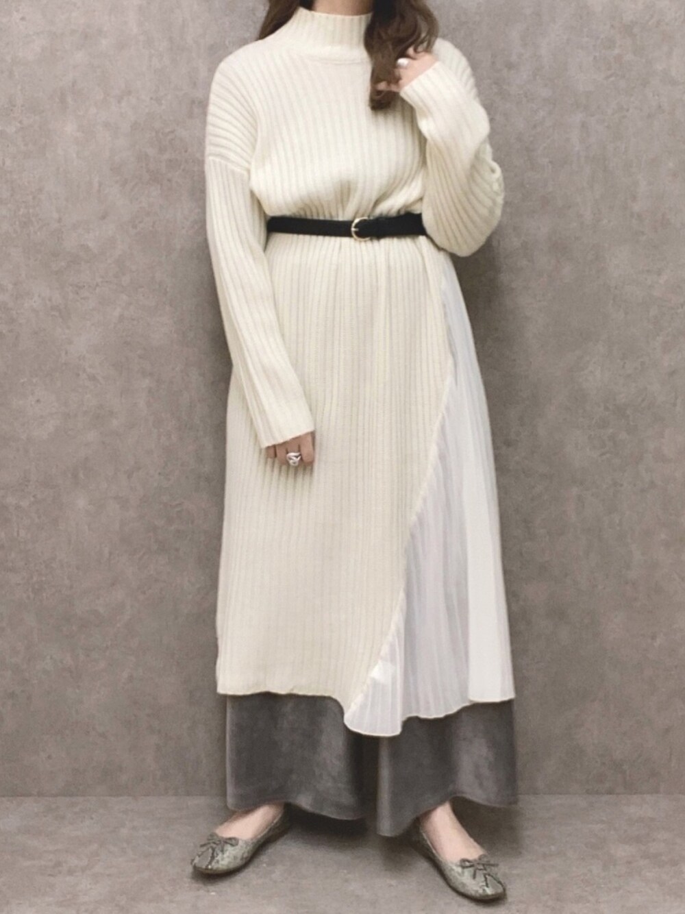 ˗ˋˏご覧いただき、ありがとうございますˎˊ˗ プチハイネックでサイドのプリーツが かわいいニットワンピース 𓅯 ⠜ ゆるっと着たかったので シルバーのベロアパンツを合わせました♩ -------------------------------- よかったら ♡ いいね 、セーブ いただけるとうれしいです・‿・