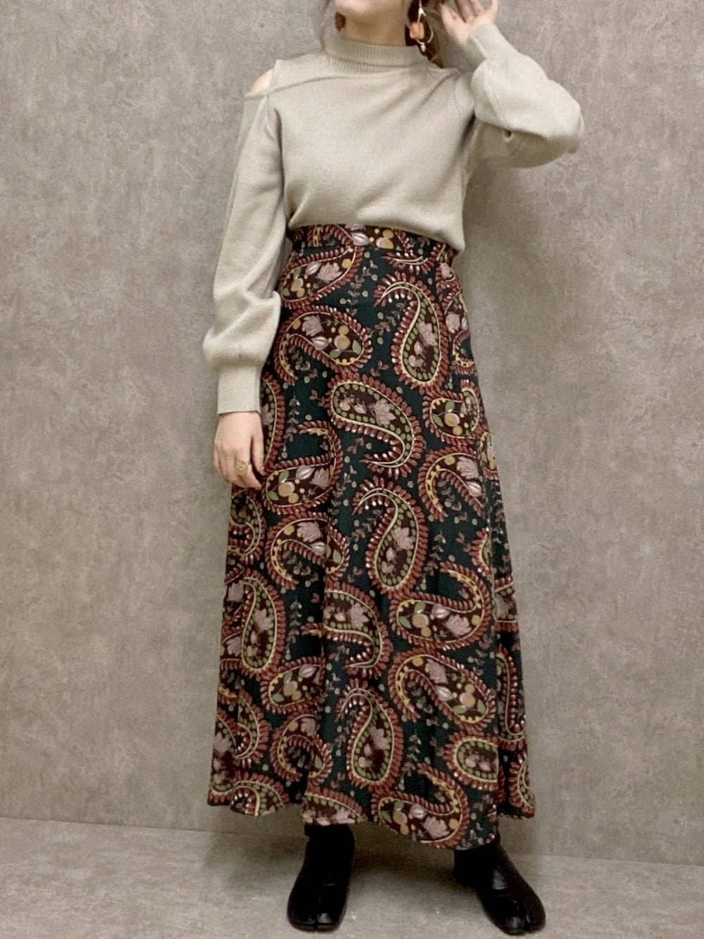 ˗ˋˏご覧いただき、ありがとうございますˎˊ˗ オープンショルダーのニット、 何にでも合わせやすいベージュカラーです✨ グリーンのペイズリースカート❤︎ ヴィンテージ、レトロな雰囲気で くすみカラーやブラックとぴったり𓏗𓏗! -------------------------------- ♡ いいね 、セーブ 、 フォロー いただけるとうれしいです・‿・