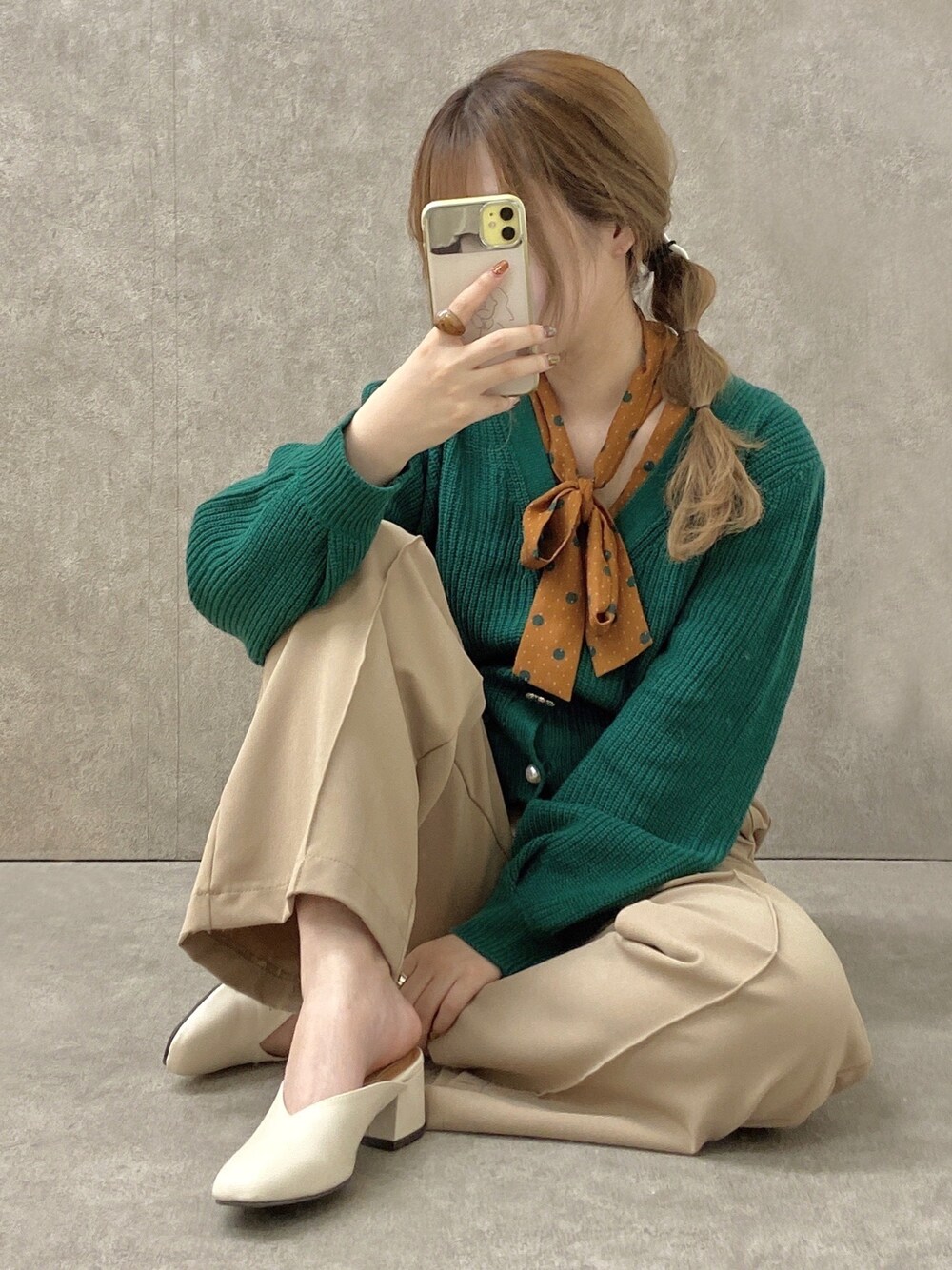 ˗ˋˏご覧いただき、ありがとうございますˎˊ˗ オレンジ×グリーンドットのボウタイブラウスに グリーンカーデを合わせた大人コーデ 🍊 ベージュは何色とも合って万能ですね \( ˆ ˆ )/ -------------------------------- ♡ いいね 、セーブ 、 フォロー いただけるとうれしいです・‿・