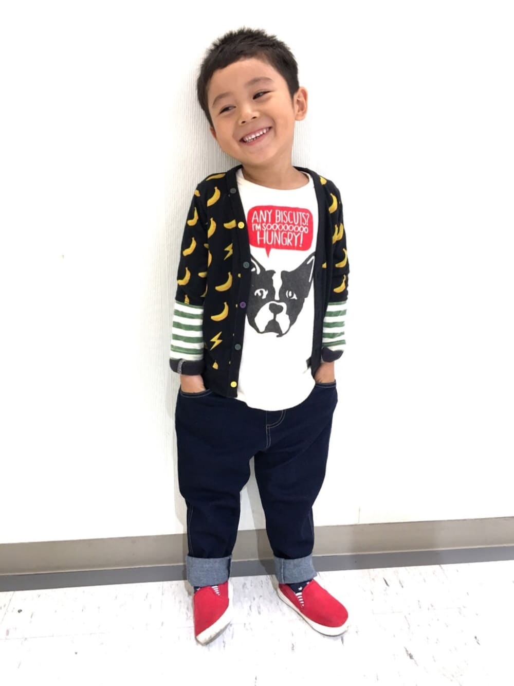 今は BREEZEに統一された "Junk store''わんこのロンTと、バナナカーデをbranshesの今期テーパードロングパンツと合わせてみました👖✨ WEARでコーデされてる方をみてさっそく購入してみましたが、やっぱりこのbranshesのテーパードパンツ、ぽわ〜んとしたかたちがツボです❤️ <身長102cm 着用デニムsize110>