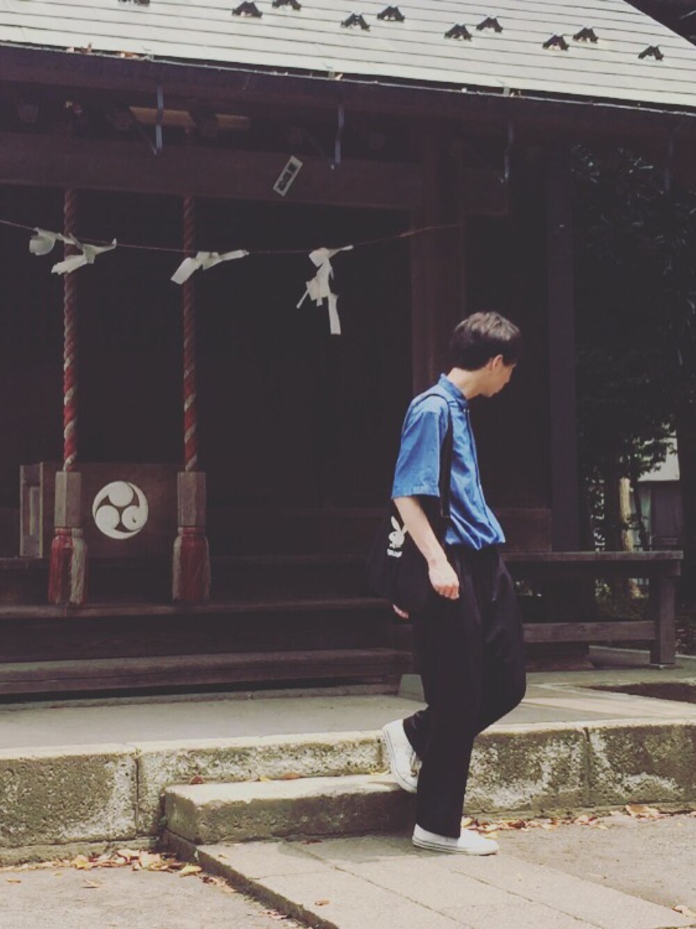 古着で手に入れたラルフローレンのワイドパンツとH&Mのビックシルエットシャツをタックインしたコーデ。