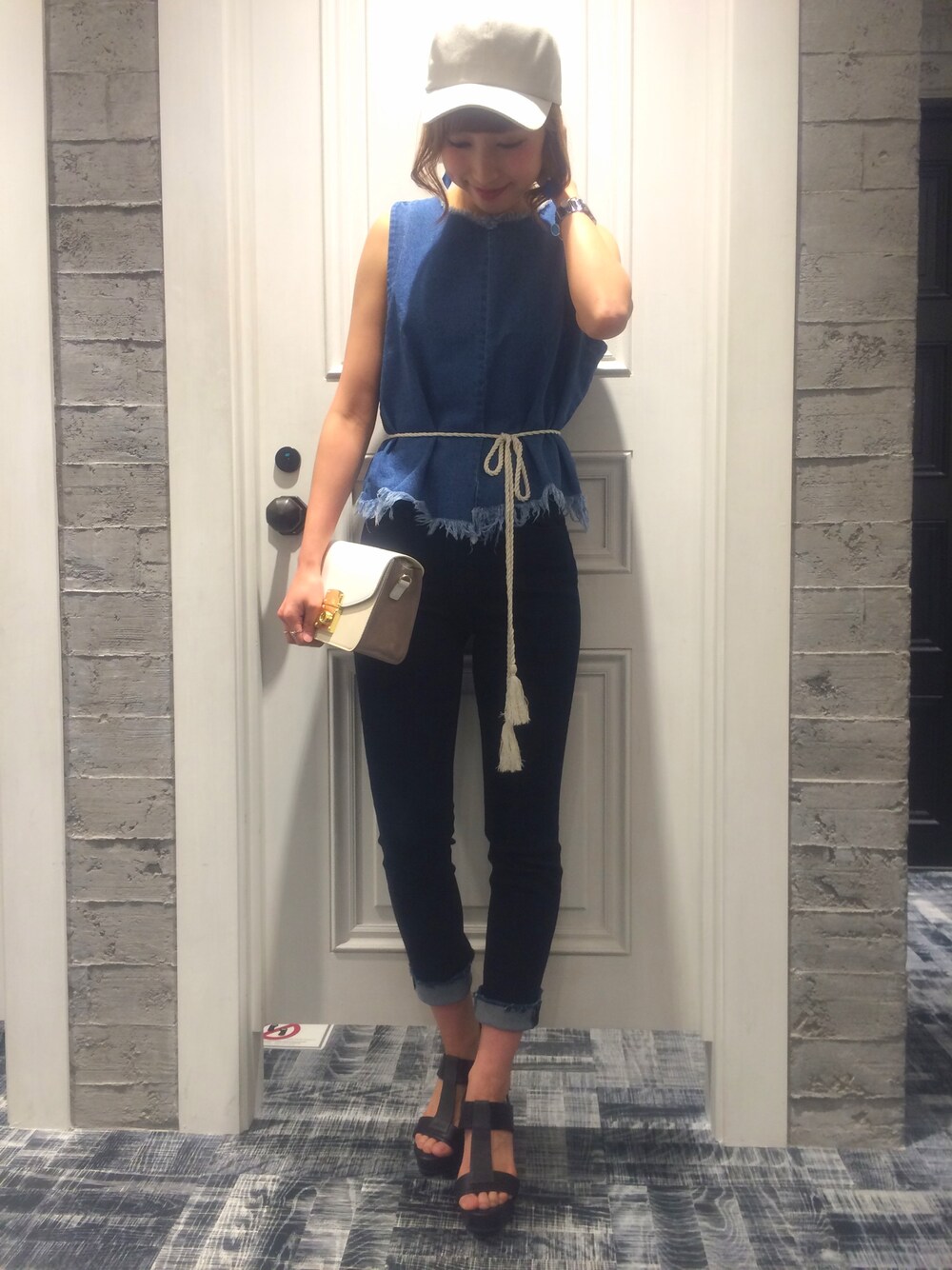 オールデニムでコーディネートしました。トップスにロープベルトを締めペプラム風にし、スタイルアップさせています。小物はホワイト系でまとめ、きれいめにしています。