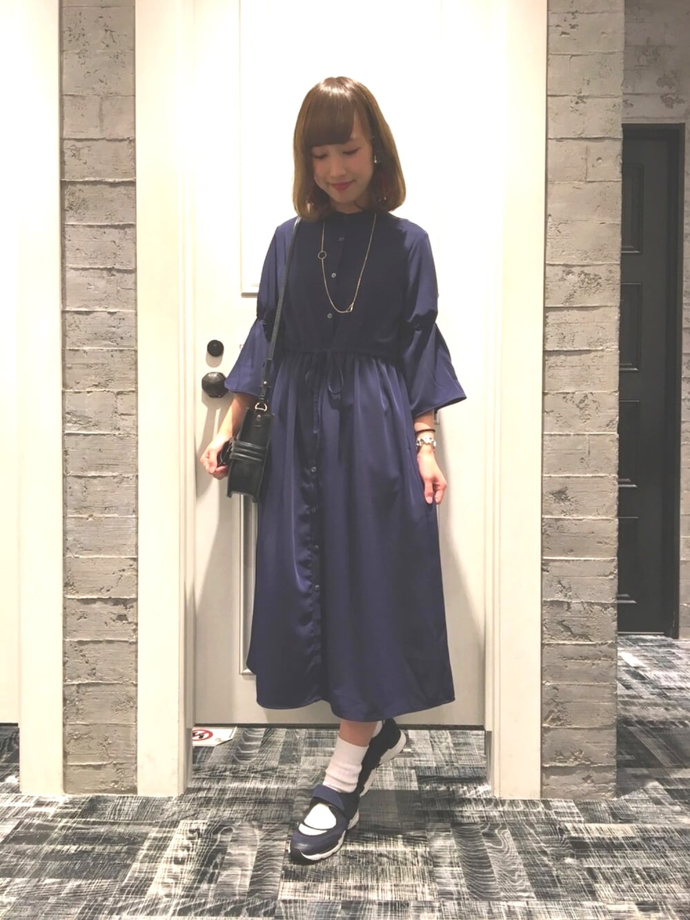 ウエストギャザーワンピースを使ったスタイリングです!ウエスト部分はしっかり結びメリハリをつけ、一枚着でフェミニンな印象を足元のスニーカーでカジュアルダウンさせています👟✨