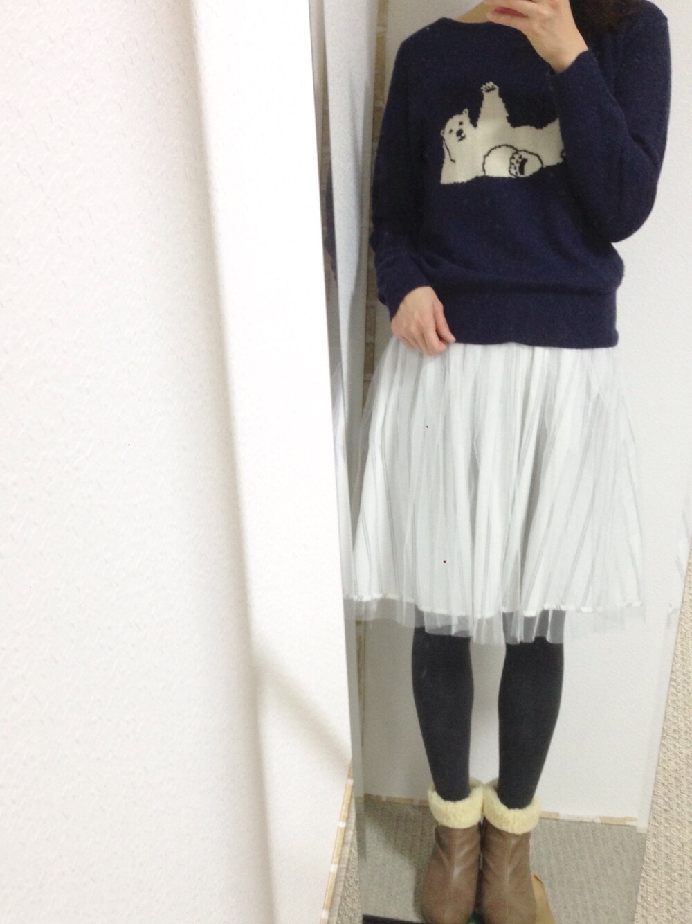 こんにちは😊 ご覧いただきありがとうございます♪ 今日はお気に入りのおとぼけクマちゃんニットにチュールスカートを合わせてみました🐻 スカートはホワイトのチュールですが、ストライプなのであまり膨張して見えない気がします😆 そして相変わらず安定の160デニールタイツです❄️笑 北海道ほんと寒すぎ! いいね、セーブ、コメント、フォローなどありがとうございます❤️ とても嬉しいです♪ お返しに伺いますね🐾