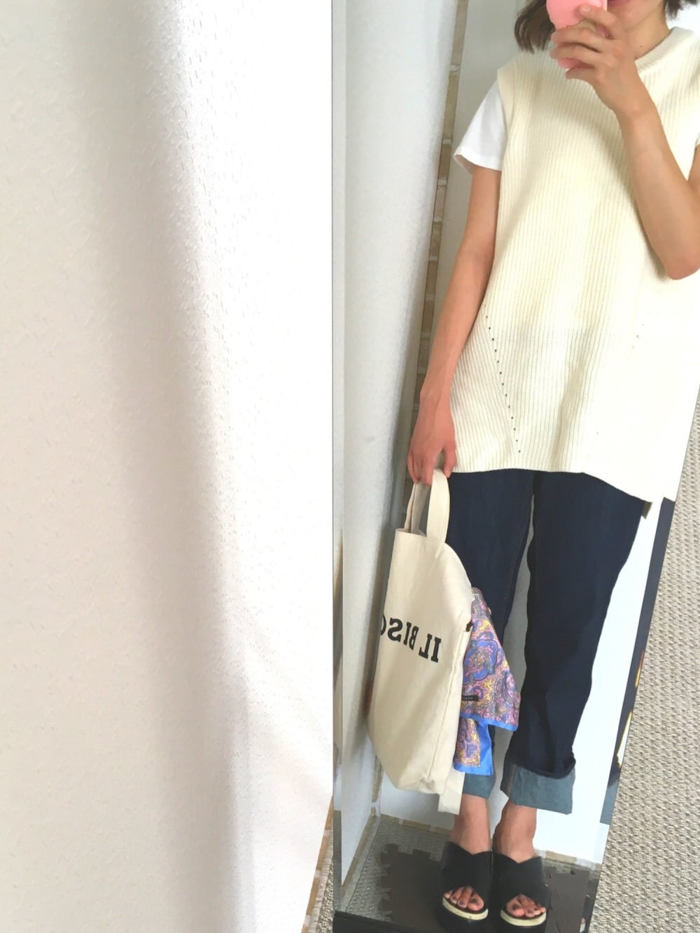 続いては、Tシャツ・デニムに合わせて大人カジュアルに⑅◡̈* インにTシャツを合わせる事で、秋の初めらしいコーデになります♪ 首元にスカーフなどを巻いても可愛いと思います⑅◡̈* chicoのクロスベルトサンダルは、ヒールは高めですが、とても歩きやすいのでヘビロテしてます(*´°`*) ブラックのカラーも合わせやすいです♪ わかりづらいですが、ペディキュアも秋カラーにシフトしました!笑 シンプルすぎるかなぁと思って付けましたが、バッグに付けたスカーフはいらなかったかも?(´・ω・`) 引き続き、方畔ニットベストの着回しを投稿致しますので、良かったら覗いて見て下さいね⑅◡̈* いいね、セーブ、コメント、フォローなどとても嬉しいです😆✨ ありがとうございます♪