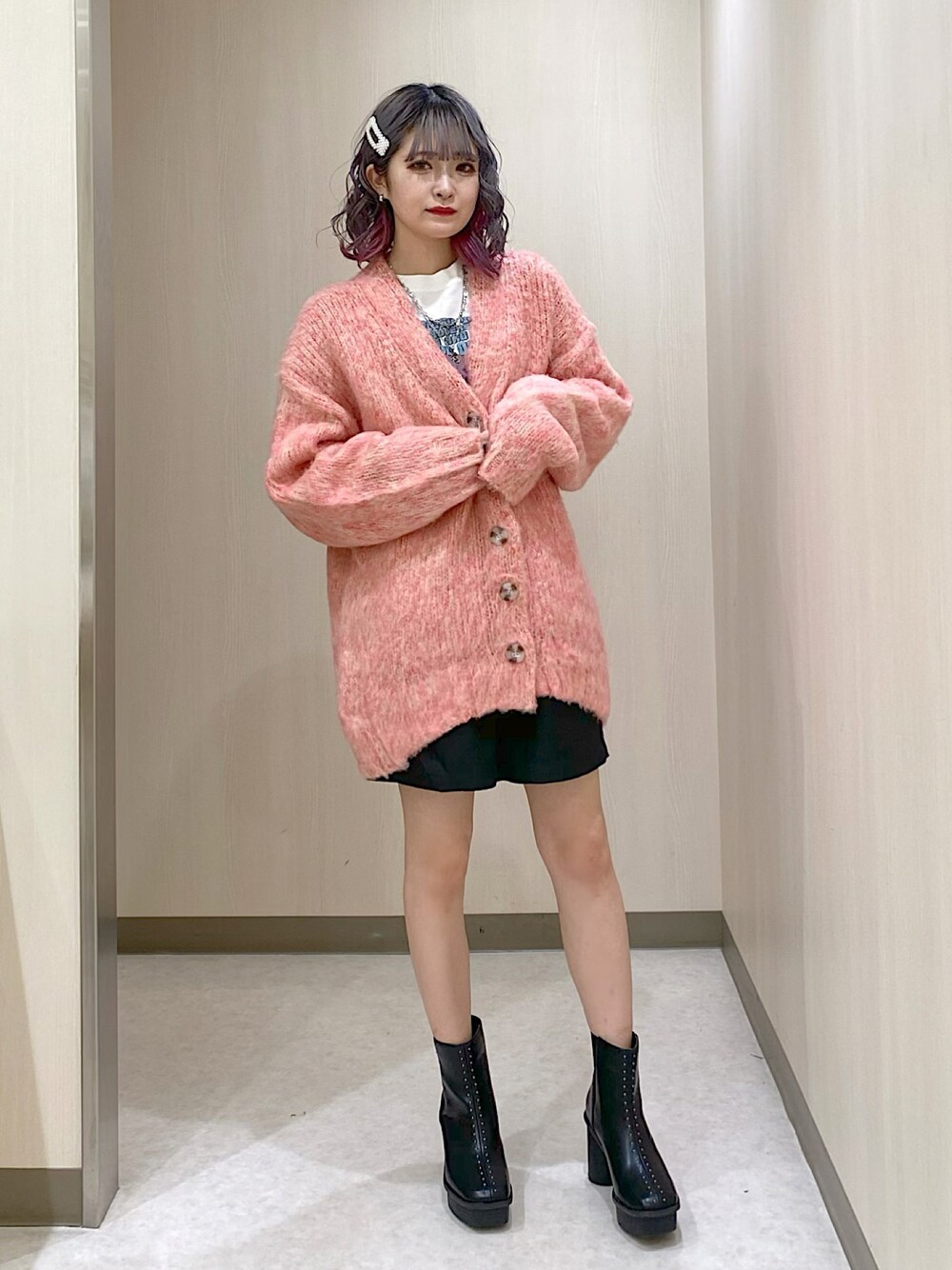 マナのカーディガン/ボレロ「ブラッシュヤーンVカーディガン」を使ったコーディネート