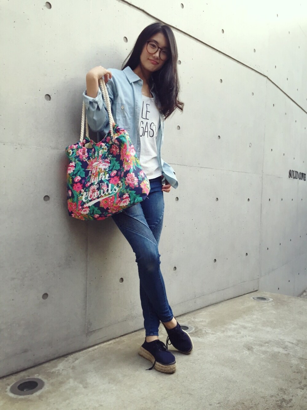 さわやかなTシャツ、デニムのコーディネートは旅行にもおすすめです‼︎ 花柄のラルトートバックはビックサイズなのでちょっとしたお出かけ用にも(*^^*)