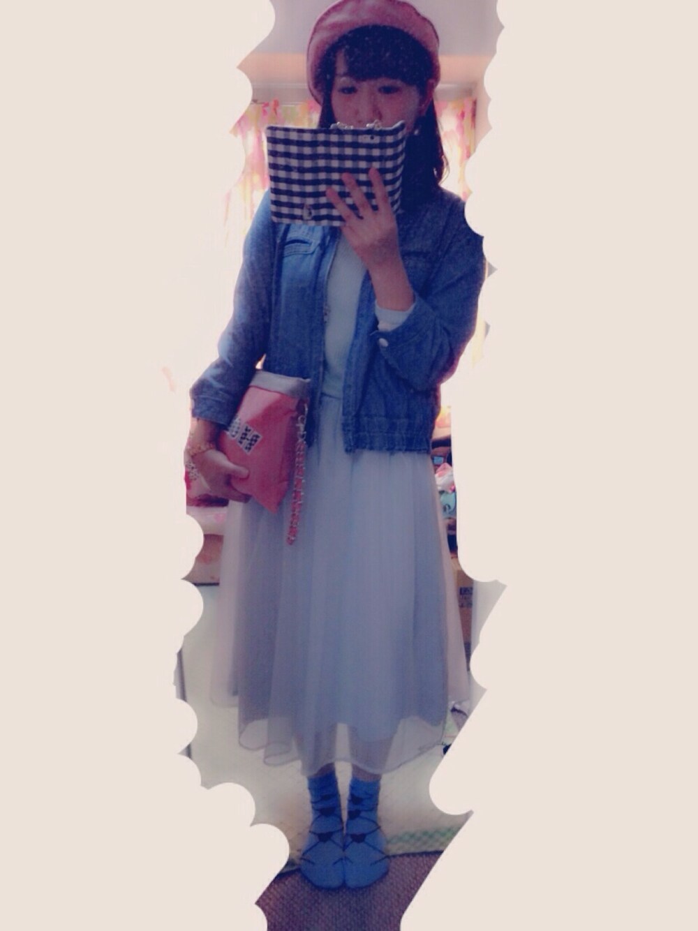 ベレー帽 / ママの ジャケット / POU DOU DOU トップス / who's who Chico スカート / Another Edition くつした / Vivienne Westwood クラッチ / Casselini 日本女子博覧会のcode 田中里奈ちゃんとコラボしてる Casseliniのクラッチと Another Editionのチュールスカート をメインにするために ピンク × ブルー で合わせました ☆ ベレー帽はなんと ママが高校生の時 やから30年前の!笑