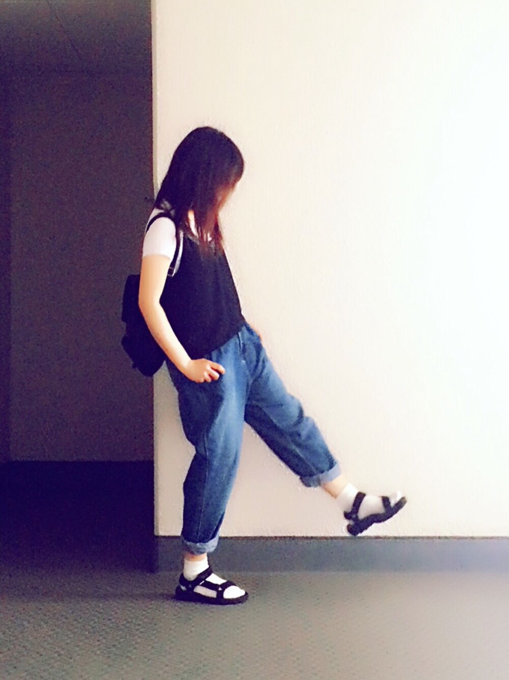 ちょっとそこまで( ^ω^ ) コンビニコーデ テバはクッション素材で歩きやすくて好き♡ GUのボーイフレンドデニムも ぶっとくて好き♡