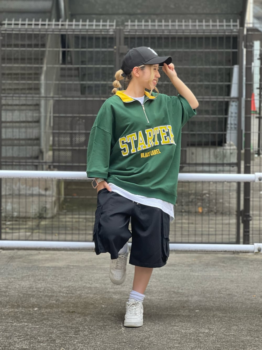 ハーフジップにカーゴショーツ合わせてみました☺️ 緑と黄色の配色が可愛くて好きです😚