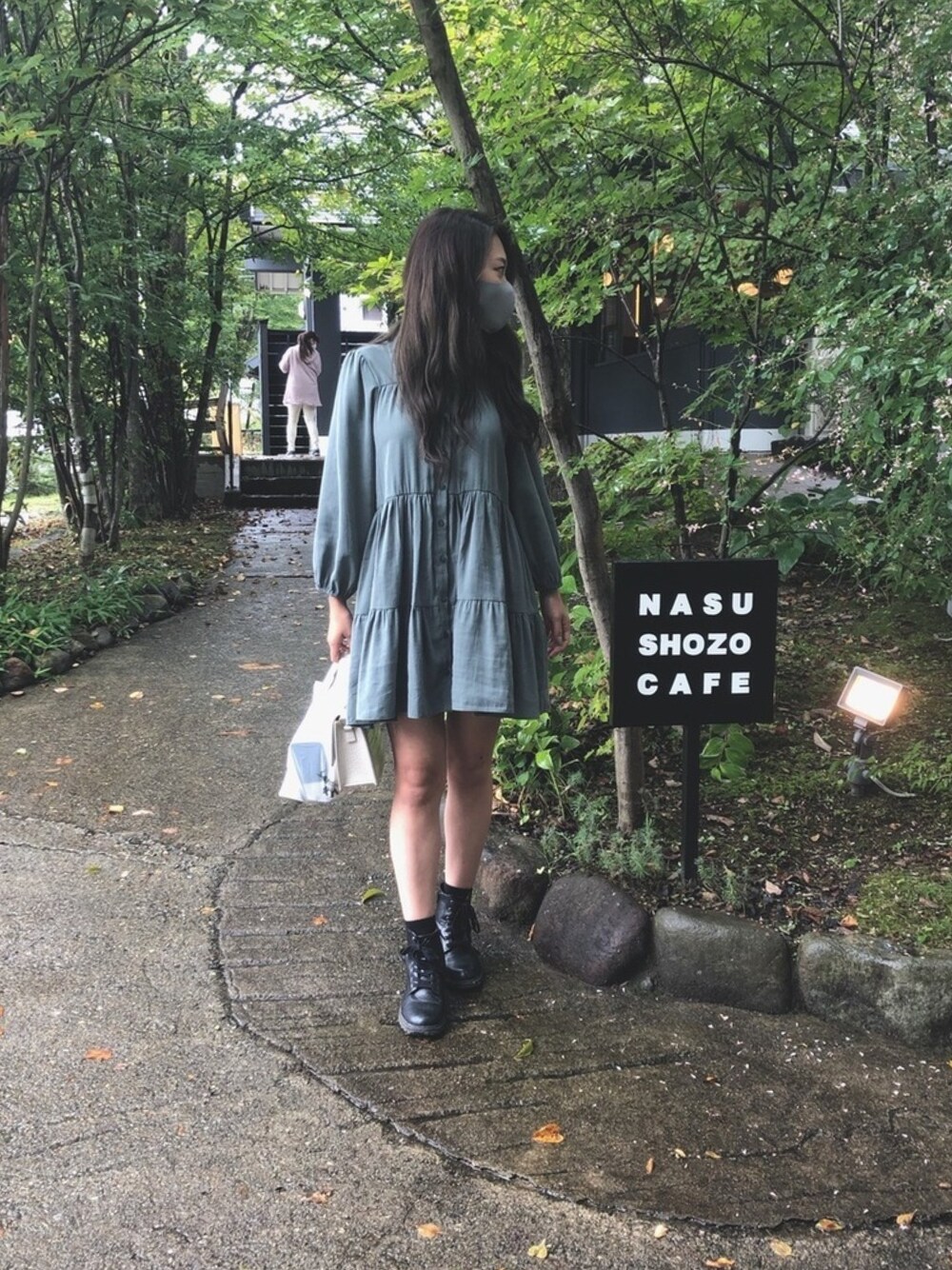 グリーン系のワンピース、ブラック系のブーツを着用したレディースの秋コーディネートの1枚目の写真