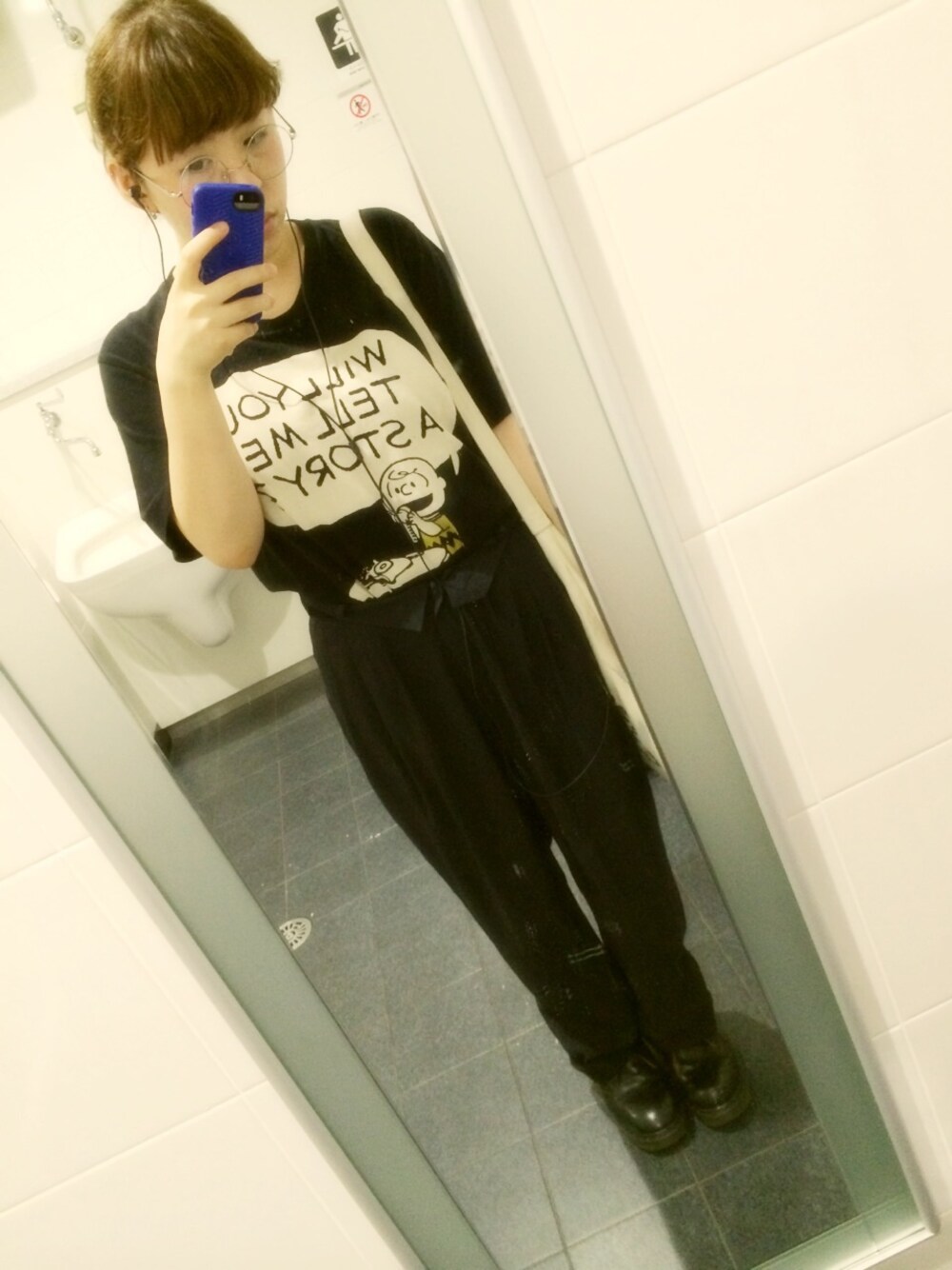 今日はオールブラック。 黒大好きなので一日機嫌よかったです 全身ブラックだったので、重くならないようにポニーテールにしてリボン巻いてみました 丸眼鏡はかけたりTシャツの襟に引っかけたりしてました(笑) パンツはテロテロなので案外涼しかったです〜