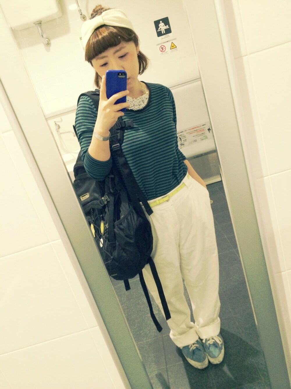 兄からのお下がりのバックパック、最近お気に入りです 父の白いパンツ、太さが好きです 家族の服やらカバンやらをもらって着るのすごく楽しい!