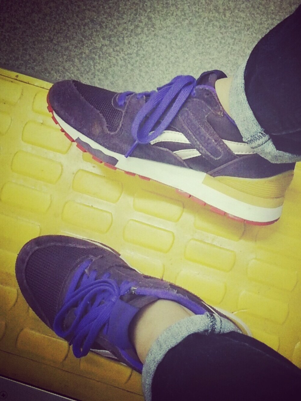 スニーカーはreebokが大好きです。 主張しないロゴがすごくいい。 紫とデニムの相性がすごくいい。