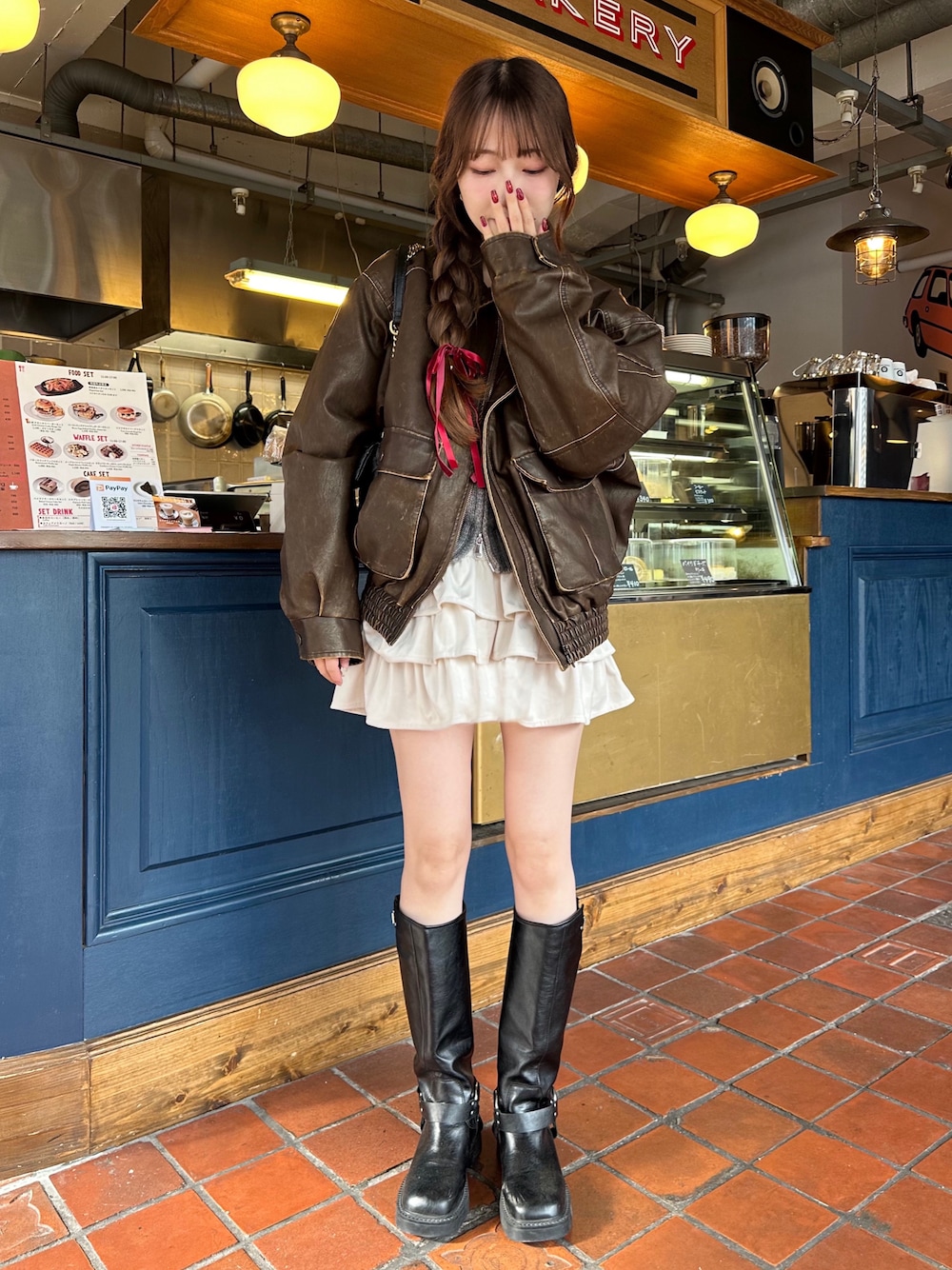 Manaka のブルゾン「VINTAGE F/LEATHER S/BZ ヴィンテージ フェイクレザー ショート ブルゾン」を使ったコーディネート