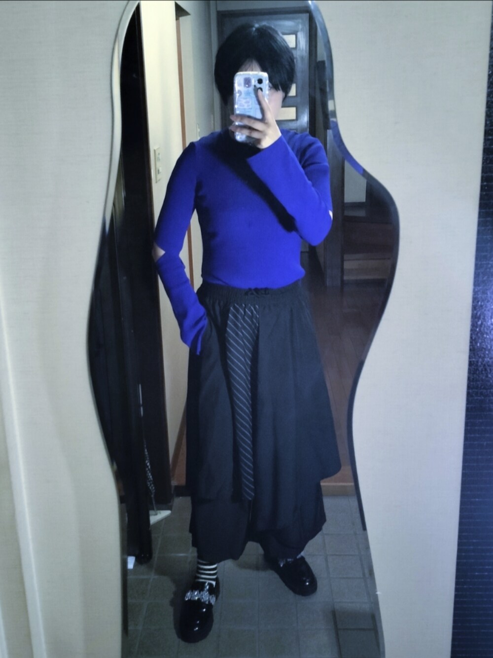トップスは肘が出る仕様になっており、 肘から袖先に広がっています。 そのおかげでとっても細く見えます💙 ボトムスははかまパンツ! ボリューミーで歩くと揺れるところが お気に入り🥰