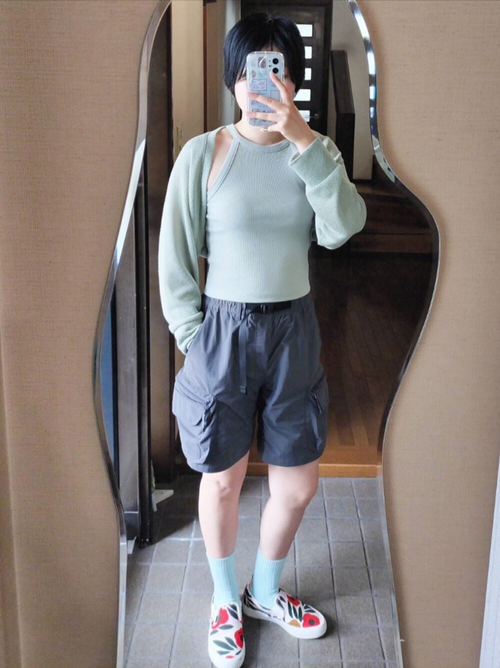 今日はGUコーデにしてみました👚 トップスはセットで490円…安い… ショーパンはメンズので 流行りのカーゴショーツふく 女性が履いてもかわいいし 筒が太いので足が細く見える!